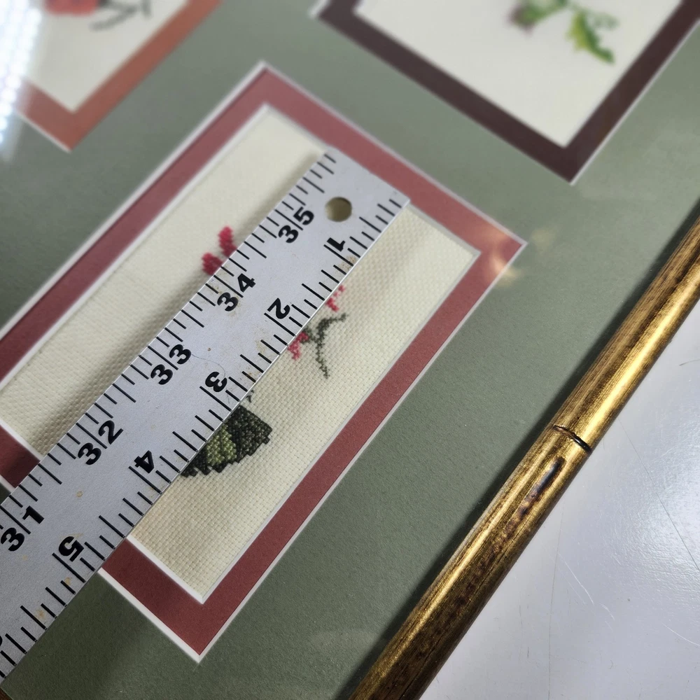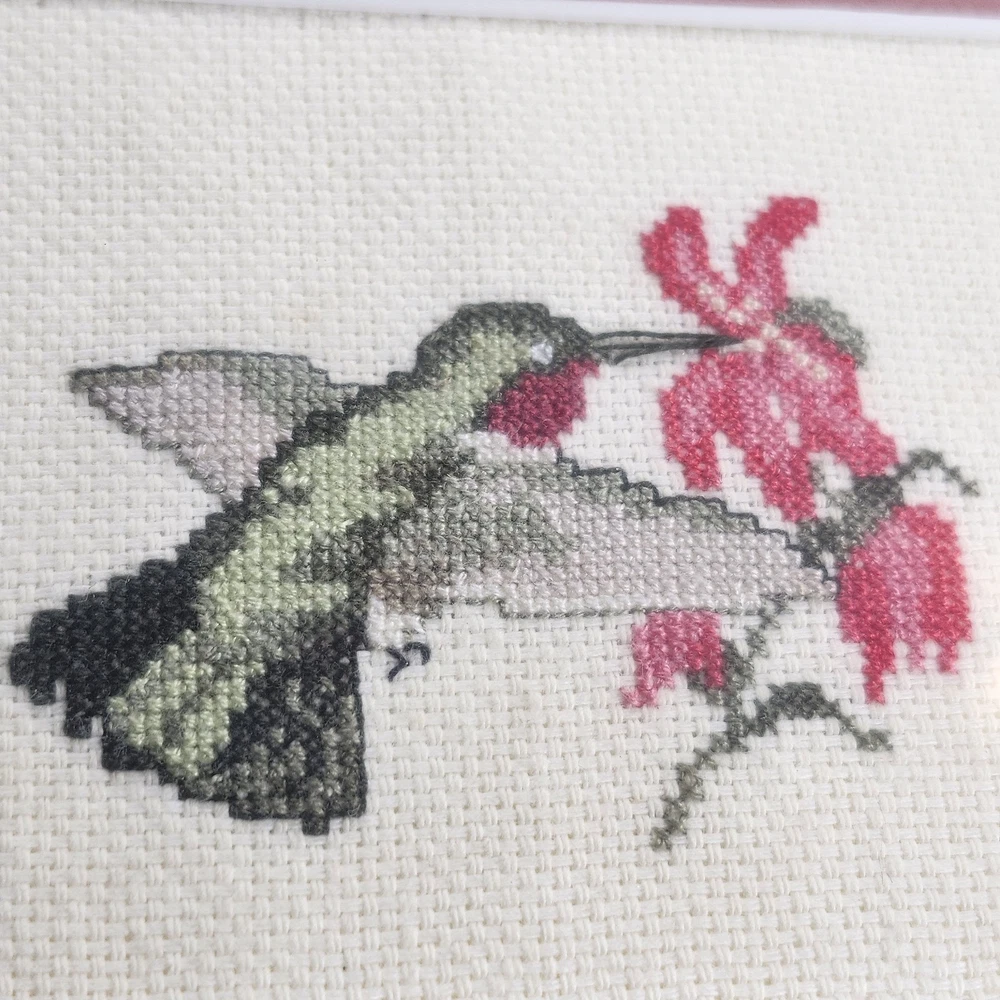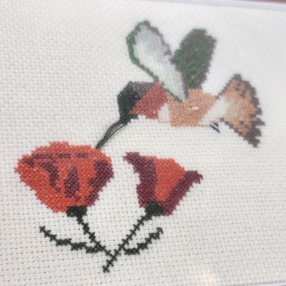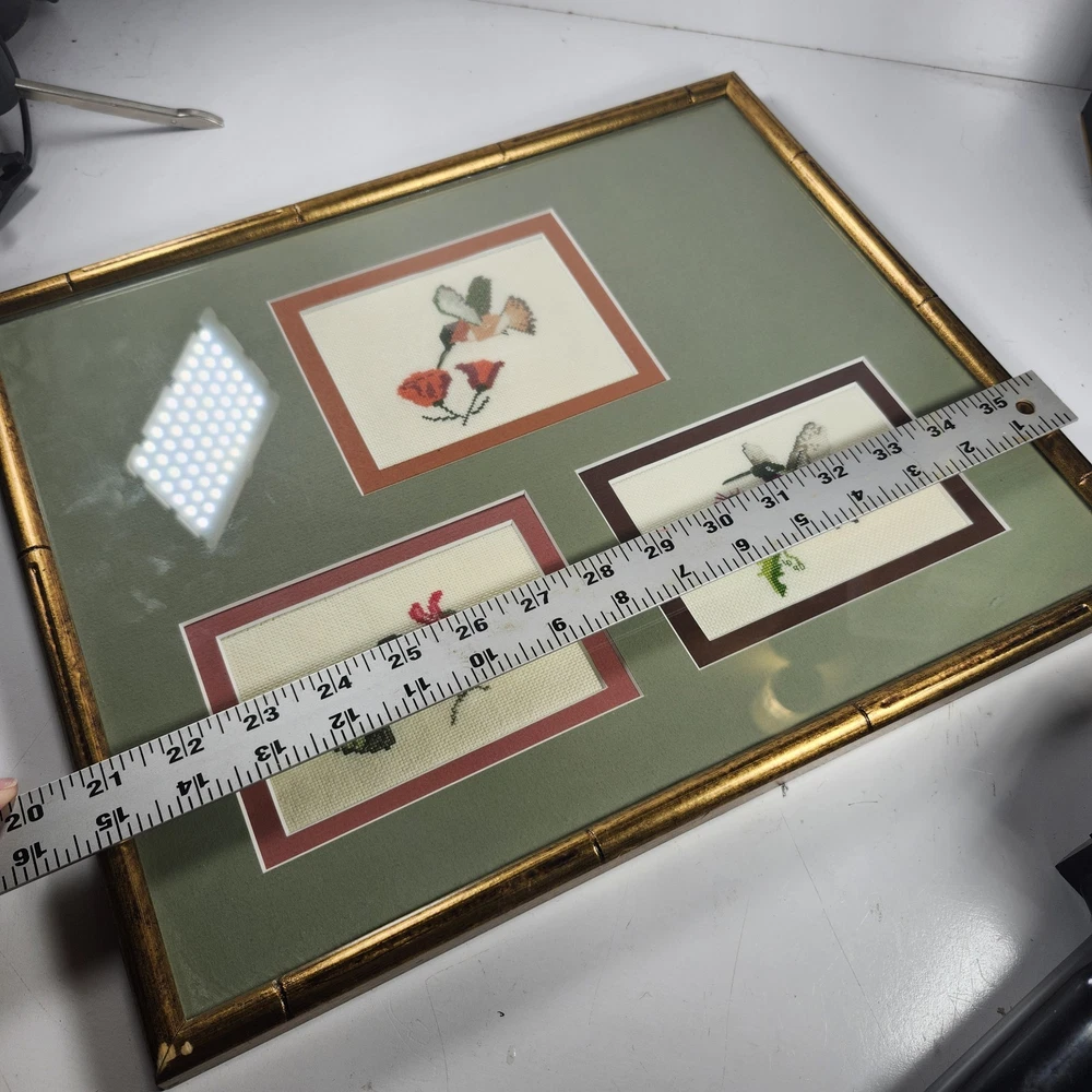 Completed Cross Stitch Artwork - 3 Humming Birds and Flowers Framed Matted. Super colorful and just gorgeous!! EUC. Professionally Matted and Framed. Frame measures about 15" x 12" with each displayed cross stitch measuring at 3.5" x 4.5". This is gift signed on the back with a date of July 18, 2015. PLEASE SEE ALL PHOTOS PRIOR TO PURCHASING!!