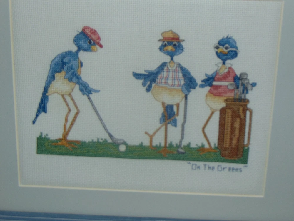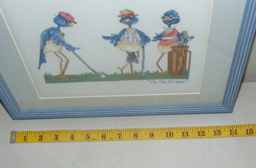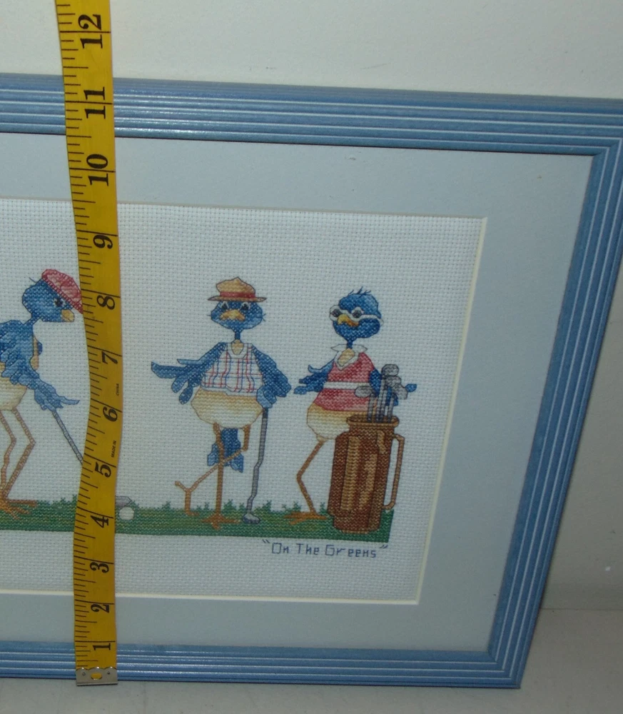 This charming piece of artwork features a group of colorful birds enjoying a game of golf. Measuring at 14 inches by 11 inches, it comes already framed and ready to display in your home or office. The intricate embroidery work showcases the skillful technique of cross stitch, making it a valuable addition to any collection of needlecrafts and crafts. This item belongs to the categories of finished cross stitch pieces, finished embroidered pieces, embroidery and cross stitch, needlecrafts and yarn, and crafts. Its aspects include being a framed cross stitch and utilizing the cross stitch type of embroidery. Invest in this delightful piece of art today!