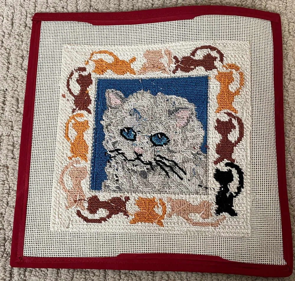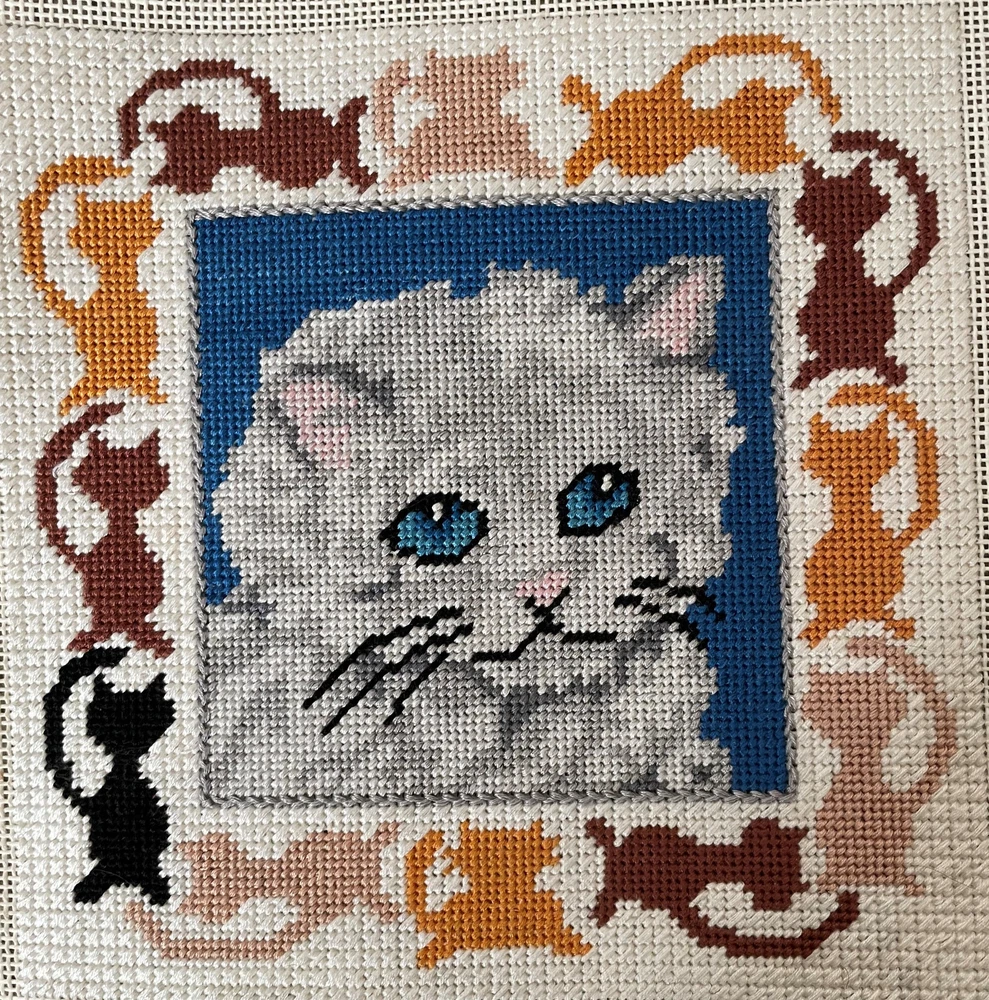 Completed Gray Cat Kitten Needlepoint Blue Eyes 8" Square