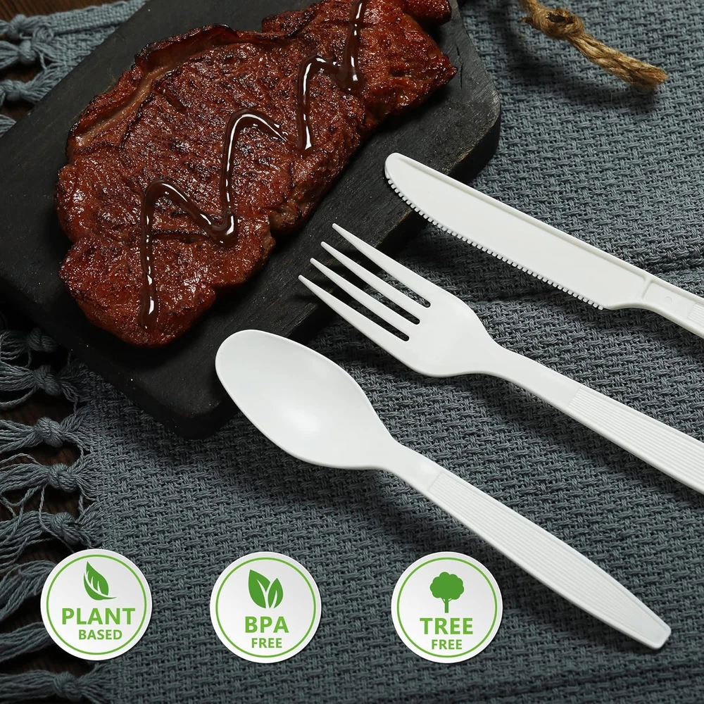 Product Description disposable tableware our disposable knives are made of corn starch, plastic-free, tree-free, a great alternative to plastic, wood, or bamboo knives. our DOSSINI silverware is truly friendly to the environment High heat resistance Disposable tableware have excellent heat insulation effect, and the heat resistance temperature can reach 120℃. There is no need to worry about damages caused by high temperature. Set includes 100 piece.The simple appearance is in harmony with any scene. You can use these disposable knives for any food and any occasion