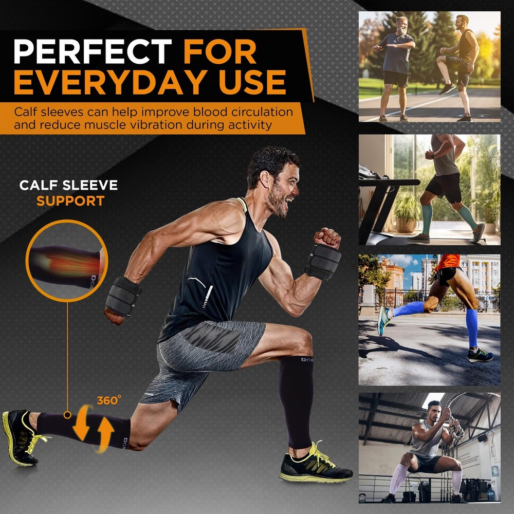 Experience the superior strength and support of 's Calf Compression Sleeves, meticulously engineered to deliver a 20-30mmHg gradient, surpassing standard calf sleeves. Engineered with a tighter grip, these sleeves facilitate swift recovery from tendon and calf injuries, providing targeted compression to alleviate discomfort and promote healing. Whether you're at home, work, or engaged in physical activities, our compression calf sleeves offer unparalleled comfort and durability, ensuring long-lasting relief and support throughout the day. Crafted from premium quality nylon and spandex fabric, these shin splint compression sleeves deliver graduated compression, effectively aiding in the relief of leg cramps, muscle soreness, and fatigue induced by extended periods of standing or sitting. Tailored for both men and women, these footless compression sleeves provide reliable protection and comfort, effectively safeguarding against shin splints, torn calf muscles, and other common ailments. Embrace confidence and ease during your daily routines or sports activities, experiencing a perfect blend of comfort and style with . At , we are committed to providing products that exceed expectations in quality and performance. Explore our extensive range of compression socks, encompassing knee-high socks, thigh-high stockings, toeless compression sleeves, elbow braces, ankle sleeves, and calf sleeves. Available in an array of colors, sizes, plus sizes, compression levels, and patterns, ensuring there's a perfect fit for every need and preference. Experience the difference with compression sleeves and step into comfort and relief today. MEDICAL GRADE COMPRESSION CALF SLEEVES FOR PAIN RELIEF: Experience medical-grade relief from leg cramps, varicose veins, and boosted circulation with our compression calf sleeves for men and women. Engineered with premium nylon and spandex for durability, breathability, and comfort. VERSATILE CALF COMPRESSION SLEEVE FOR MEN AND WOMEN: Our compression calf sleeves are perfect for running, hiking, or everyday use, providing medical-grade support during pregnancy or long hours of standing. Speed up recovery and enjoy value for money with our compression sleeves. Available in a variety of colors and sizes. FAST RECOVERY AND SUPPORT: Speed up recovery with our 20-30mmHg medical-grade compression calf sleeve, providing support to ligaments, tendons, and calf muscles. Ideal for athletes and workers alike, these sleeves offer unmatched comfort and relief. DOCTOR-RECOMMENDED MEDICAL GRADE COMPRESSION: Trust in our doctor-recommended compression calf sleeves for graduated compression and exceptional comfort. Get relief from shin splints and leg fatigue, perfect for runners and everyday use. ENHANCED PERFORMANCE AND COMFORT: Experience enhanced performance and comfort with our compression calf sleeves. Ideal for athletes and those seeking relief from leg fatigue, our sleeves provide medical-grade support without compromising on comfort.