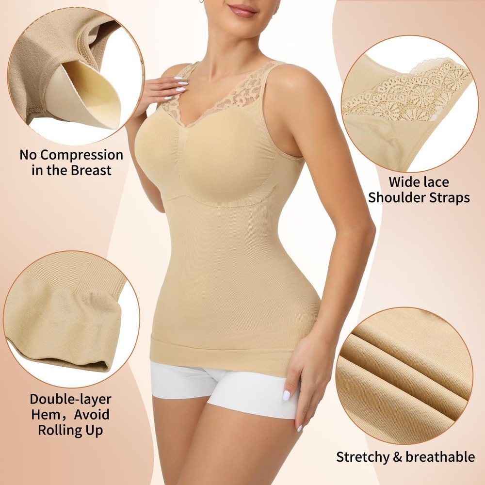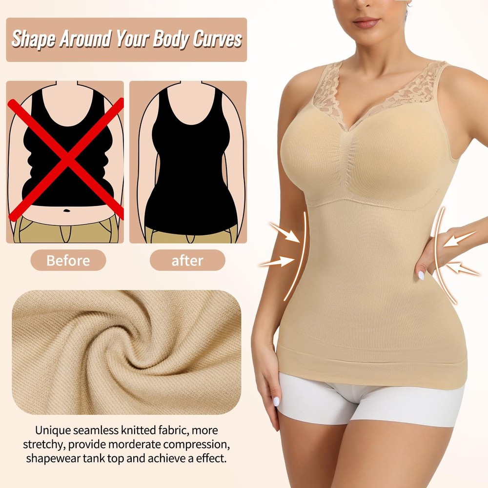 Select a tummy control shapewear tank top that corresponds to your measurements. Refer to the sizing chart provided by the manufacturer to ensure an accurate fit. 【Removable Cami Shaper With Built In Bra】compression tanks for women suitable for different size busts, comfy fit without moving/ folding or pad lines. and have good support. The removable pads provide slightly support and snug your breast with no compression, You can also remove the pads and wear your own bra as your choice. and you can remove it when you washing. 【Breathable & Comfortable Fabric】shapewear tank top is made of 96% nylon 16% Spandex, soft, breathable and not sticky, sufficient stretch to fit people of different body types, without rubbing the skin super comfy for all-day wear. 【Shape Around Your Body Curves】Womens shapewear tank top with built in bra and Lace wide shoulder straps that they don't dig in. The charming V-neck design helps to improve your neckline, highlight your charming collarbone, enhance your temperament greatly. Double-layer strengthened hem reduce the bottom rolling up when you move. 【No Compression In Bust Area】shapewear tank tops for women the control starts under the bust area. No worry about compressing your breasts. you can choose to wear your own bra or go without one. This shapewear cami offers a snug fit for your breasts without causing excessive compression. It ensures comfort while properly lifting and enhancing your bust. 【Seamless Shapewear Tank Top Wear Correctly】Body contour high compression tank Stretchy camisoles should always be put on feet first and then gently tugged up to the chest. fit. The slimming cami suitable for any occasion, as party, evening, date, work, daily life ect, and prefect to worn with shorts, jeans, pants, skirts, high heels, boots. You will look better and feel more confident to wear it for formal occasions, work or daily life.