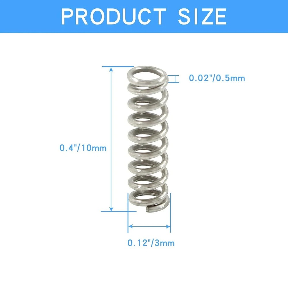 【Package Included】 Wire Diameter: 0.5mm/0.02"; Outer Diameter: 3mm/0.12"(OD); Free Length: 10mm/0.4". ✅ 【High Quality Material】The compression spring is made of stainless steel, compared to music silk, it has greater corrosion resistance and heat resistance, high elasticity and hardness. ✅ 【Feature】This compressed spring is sturdy, reliable, and easy to operate. Multiple open coils can be used to resist external pressure. It will not rust when used in damp environments. ✅ 【Wide Application】The coil spring can be suitable for various household and professional applications, such as doors, curtains, cars, electrical appliances, mechanical equipment, repair toys, etc. It is a good helper in daily life. ✅ 【Excellent After-Sales Service】We offer a 30-day return and replacement service. If you have any questions, please feel free to contact us, we will try our best to help you, thank you very much for your support!