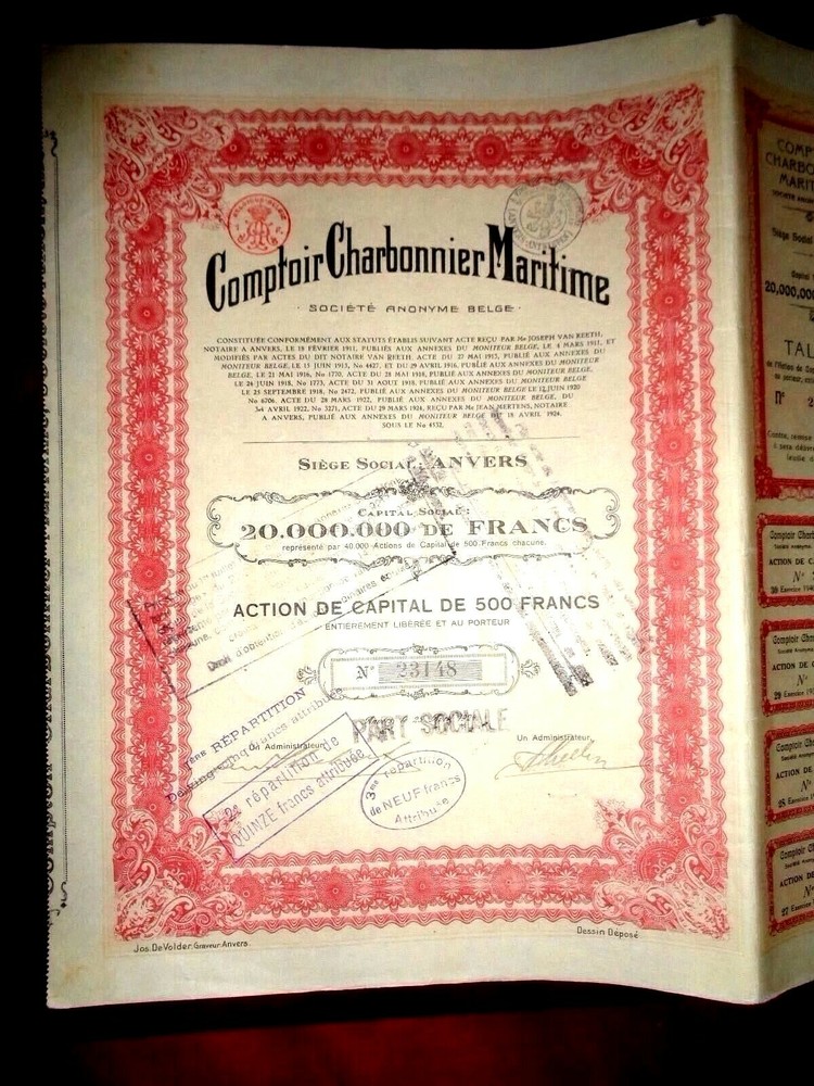 One share certificate of "Comptoir Charbonnier Maritime",share certificate,Belgium 1924 ,share certificate,Anvers,Belgium . Condition (opinion): Very Good (VG) ,see scan .Printer:Jos De Volder, Graveur Anvers.Two hand signatures Contains coupons nr 14 to Nr 30.Coal trade shipping agency.The company has its origins in the Coal departments of the firm JF& F.SCHELLEN . Founders (of the "Comptoir Charbonnier Maritime" Mr. Fréderic Schellen.Becames later in 1928 the "Comptoir Charbonnier Maritime et Commercial" .Uncancelled .Several handstamps. ---------------------------------------------------------------------------------------- Historical document for collectable or historical research purposes with (scripophily) value only. Use this picture for reference only, serial number may be different. Please read carefully the sale terms ,shipping conditions and information below. The buyer accepts those terms, conditions and cost described. ---------------------------------------------------------------------------------------- Terms of sale and shippig information Postage, including packing material, handling fees : Europe: USD 9.70 / USA $ 10.70. Rest of the World: USD 12.00. FREE of postage for other items. (excluding purchases under US$70.00 with a weight greater than 100 gr. including the protection and packaging card ) . Only one shipping charge per shipment (the highest one) no matter how many items you buy (combined shipping). ----------------------------------------------------------------------------- Guaranteed genuine - One month return policy (retail sales) . Returns accepted with no questions. Customers are invited to combine purchases to save postage. As we have (or could have) more than one identical item ,the serial number may differ from those shown in the picture which is for reference only. For purchases above $70.00 we send the orders registered with tracking number without extra charge, for purchases below $70.00 we ship as regular letters at the buyer's risk. For purchases below $ 70,00 who want to register your letter with tracking number, please add an extra for : Europe $4.20 , U.S. $5.00 ,Rest of the word $5.90 .For this case ,please request or wait for our invoice before paying. Postage include packaging material and handling fees. For some destinations and purchases below $70.00 customers may be requested for this extra shipping payment in order to register the shipment with tracking number. We reserve the right to cancel transactions that require the sending of unregistered letters (without tracking number) to some destinations when this extra payment has been requested. For purchases over $70.00, the excess weight will be free. For purchases under US$70.00 with a weight greater than 100 gr. including the protection and packaging card, the buyer is asked not to make the payment until receiving the invoice or shipment note, since the cost will be calculated and the type of shipment will be assessed (registered or insured or not) and the buyer will be charged the approximate total of the costs of the Post Office rate (rates that are public and can be consulted), in this case the costs of packaging materials, handling and delivery management are free. In the event that the buyer has already made the payment, he will be asked to pay the difference that is missing for the payment of the postal rate. Likewise, we reserve the right to cancel transactions that have not been paid this extra amount when requested. If for any reason, your item did not arrive yet, or you are not 100% satisfied with the item you have received, please do not hesitate to contact , I will do all it takes to provide the best service. The buyer must notify to us of the delay in the arrival of his purchase when he meets 3 weeks ( to Europe) to 4 weeks (rest of the World) . --------------------------------------------------------------------------------------- Banknote Grading UNC AU EF VF F VG G Fair Poor Uncirculated About Uncirculated Extremely Fine Very Fine Fine Very Good Good Fair Poor Edges no counting marks light counting folds OR... light counting folds corners are not fully rounded much handling on edges rounded edges Folds no folds ...OR one light fold through center max. three light folds or one strong crease several horizontal and vertical folds many folds and creases Paper color paper is clean with bright colors paper may have minimal dirt or some color smudging, but still crisp paper is not excessively dirty, but may have some softness paper may be dirty, discolored or stained very dirty, discolored and with some writing very dirty, discolorated, with writing and some obscured portions very dirty, discolored, with writing and obscured portions Tears no tears no tears into the border minor tears in the border, but out of design tears into the design Holes no holes no center hole, but staple hole usual center hole and staple hole Integrity no pieces missing no large pieces missing piece missing piece missing or tape holding pieces together --------------------------------------------- See below related information from the web: Société créée pour la reprise du département charbons de la firme J.F.& F. Schellen. Elle avait pour activités le commerce des charbons, l'aquisition et l'exploitation de steamers et allèges et toutes opérations maritimes nécessaires à ce commerce. M. Frédéric Schellen fut nommé statuairement directeur pour une durée de 20 ans. Le capital fut réduit en 1925 et 1928 pour être ramené à 3,25 millions. Devenu le Comptoir Charbonnier Maritime et Commercial en 1928. Completed 4/1925,1456grt, by Antwerp Engineering Co., Hoboken (89) as JORDAENS for Comptoir Charbonnier Maritime (Schellen’s Ship Agency), Antwerp,BEL