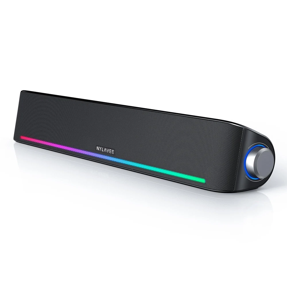 【Top-notch Stereo】: computer speakers equip with two double-layer neodymium magnets full-range speaker units and two independent bass diaphragms to provide rich high pitch and powerful bass, which will provide you with an unparalleled audio experience on music, movie, and gaming. 【4 Dynamic Lighting Modes】: The computer speakers for desktop pc come with 4 dynamic RGB lighting modes that can be customized to your liking. The lighting modes include rainbow, breathing, flowing, and rhythm to add an extra level of visual appeal to your entertainment setup. 【2 Connection Methods】: There are 2 connection methods for the pc speakers which are Bluetooth and 3.5mm Aux wired connections. desktop speakers are compatible with laptops, desktops, PCs, monitors, phones, tablets, Xbox, PS5, etc 【USB Powered & One-Knob Operation】: The speakers for pc have no built-in battery, just plug the USB plug into any power source then it will turn on automatically. All functions of the USB speaker are operated simply by the knob on the side. 【The Advantages】: The special cavity design and luxury configurations of desktop speakers not only bring a deep and powerful bass but also a clear and rich high-pitch performance. Perfect computer sound bar for bedroom