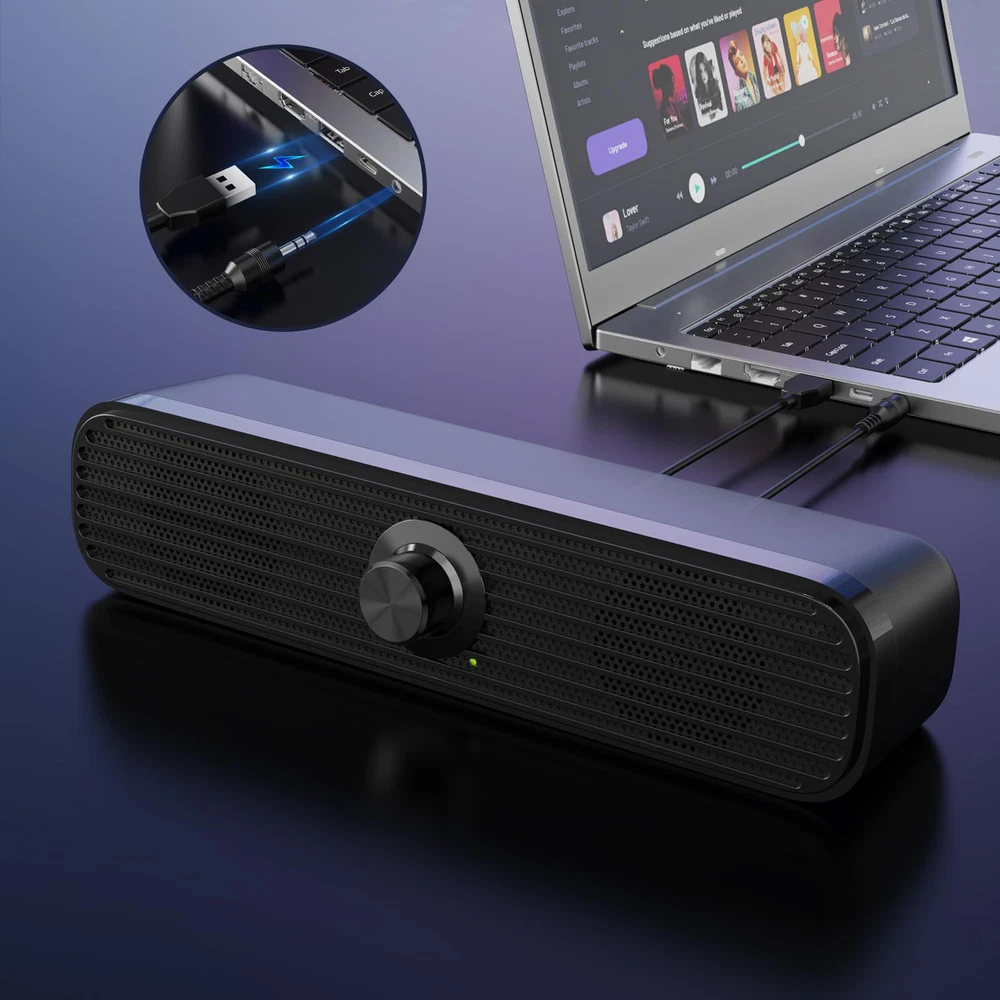 Wide Compatibility: The Computer Speakers can work with any devices that has a standard 3.5mm AUX audio jack, any brands or models of Windows(7/8/10/11) or Linux PCs, MacOS laptops, desktop monitors, laptops, tablets, cellphones, MP3, MP4. Warm Tips: The speaker is not compatible with some products, please check whether your device has an AUX port before purchase.The USB charging cable and 3.5mm audio cable must be inserted at the same time to work. Enhanced Stereo Sound: Built-in dual 3W stereo speakers of the desktop speakers can deliver you loud and crystal clear voice sound, deep bouncy bass and all the details you want to hear clearly, providing immersive Hi-Fi audio listening and immersive gaming experience. The USB wired speaker is perfect for you to enjoy wonderful movies, videos, music and games. Rotary Volume Control Knob: With the front rotary knob of the PC speakers, you can steplessly adjust the volume level as you wish. No matter loud and immersive action movie or quiet and peaceful music, the desk speakers can always satisfy your needs. No need to find out the volume setting on your device and no complicate operations, just rotate and enjoy. Mini and Space-saving for Desk: The USB speaker size is only 26 x 6 x 6.3 cm/ 10.2 x 2.4 x 2.5 in, it can fit into any corner on your desk, table, shelf or other narrow space under your desktop monitor or PC. Under the laptop speakers are anti-slip silicone pads to prevent unwanted scratches from your furniture or electronics. Elegant and delicate design, simple but classic to match your room style. Plug and Play: Just connect the speaker with your powered device or DC power adapter via USB-A cable, then plug the 3.5mm audio cable into the 3.5mm AUX jack, rotate the volume knob to moderate volume level. For some device you might need to switch the audio output to the speaker. Then the computer speakers for desktop pc are ready to play stereo music for you. The two USB-A and audio cables are connected as one for neat organization, also you can divide them as you like. Warm Tips: Using this computer speaker requires your device to have a 3.5mm AUX audio output port. The USB charging cable and 3.5mm audio cable must be inserted at the same time to work