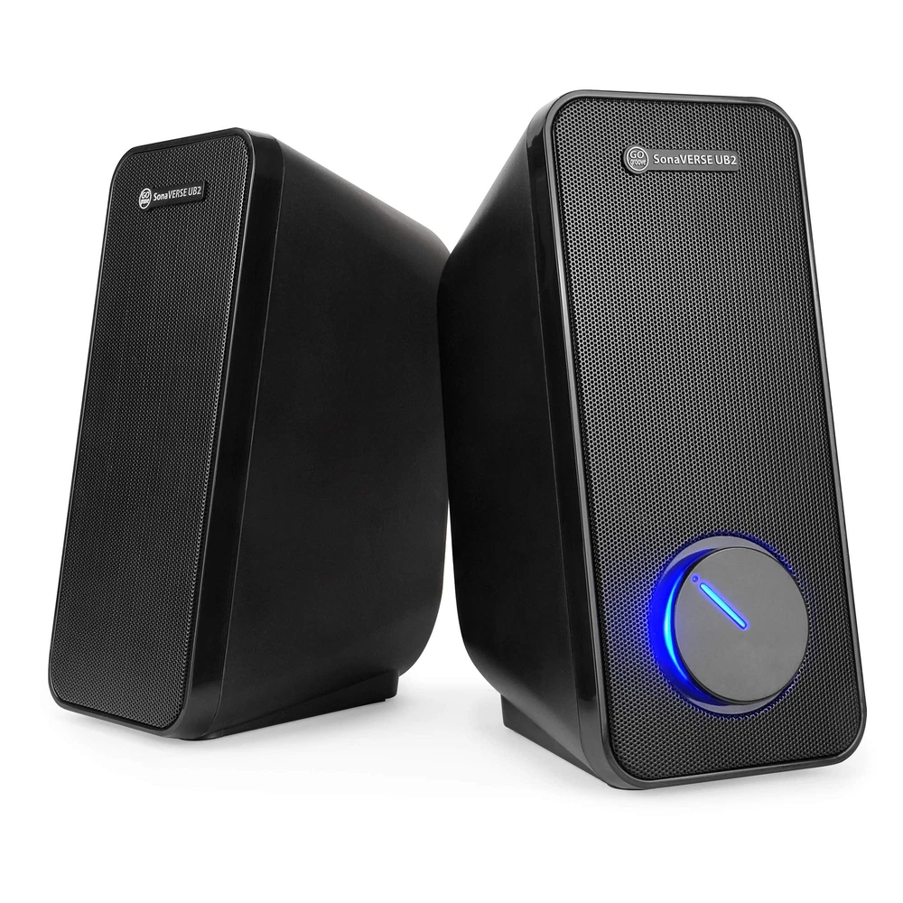 SonaVERSE UB2 Multimedia USB Powered PC Speakers for Desktops & Laptops 2-Way Speaker Design Enhances Clarity and Bass 's UB2 speakers have a 2-way driver construction that allows each driver to focus on specialized frequency ranges so that together they deliver crystal clear audio. The smaller tweeter handles high frequencies while the larger driver produces the mids and lows for solid bass. This way, each driver is dedicated to a fine-tuned frequency range and you experience fuller sound by preserving the bass of blockbuster booms and blasts while still delivering clear dialogue. Simple USB Powered Setup for Easy Listening Built-in 60" USB power & 3.5mm AUX audio cables let you connect the UB2 directly to your computer without the need for an AC outlet. Experience 2.0 bass-rich audio without messy cable nests found with 3-unit speaker systems (left channel, right channel, separate subwoofer) and all their audio/power connector cables. Convenient Pass-Through & AUX Ports Connect headphones to the UB2's built-in 3.5mm port to enjoy private listening, all without having to unplug the UB2 speakers from your PC to free up the port. If you want to play audio on UB2s off a or , you can connect using a 3.5mm AUX cord (not included) to the built in bypass audio port. 32W Peak Audio Power With a 1.5-inch tweeter and dedicated 3-inch driver in each UB2 speaker, you will experience 32W of peak audio power when binging on your favorite shows and movies. Each speaker measures 8-inches tall, 3.4-inches wide, 4.4-inches deep, and are connected to each other with 45-inch cord that allows sufficient separation for most computer monitors. The LED-lit volume knob lets you adjust how loud you want to enjoy your media and is always at hand's reach for ultimate convenience. ULTRA CLEAR BALANCED AUDIO – Specialized 2-way drivers with fine-tuned frequency ranges produce optimal sound; tweeter handles high frequencies while larger driver delivers bass via mids & lows SIMPLE SETUP WITH 60" POWER & AUDIO CORDS – Experience rich stereo audio in minutes with easy Plug-and-Play installation: USB 2.0 cable for power and 3.5mm AUX headphone jack cable for audio input HEADPHONE & AUX INPUT PORT ENABLED – Connect headphones directly to speakers for private listening, or play audio from a by connecting with your 3.5mm AUX cord to bypass PC audio PRECISION-TUNED DESKTOP SPEAKERS AT AN AFFORDABLE PRICE – Enjoy superior audio detail with crystal-clear dialogue, high-quality construction, easy setup, and conveniently long connection cables LED VOLUME KNOB – Functions as On/Off power switch and volume dial that glows blue around edge to complete the premium build design of the UB2 | Quality backed by a 3 Year Manufacturer