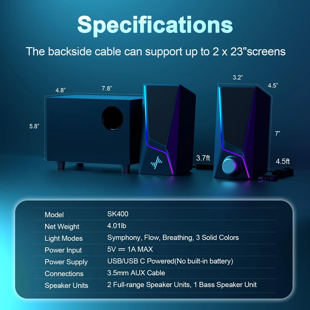 【Dynamic 2.1 Channel Audio】: Elevate your audio experience with 28W computer speakers with subwoofer, providing distortion-free Hi-Fi sound for enhancing music, movies, and gaming journey with two large speakers. 【Boosted Bass Performance】: Enjoy the deep, resonant bass from the 2.1 speaker system. The wired subwoofer's 4 inch speaker unit and downward-facing design maximizes ground reflection, enriching the low-end frequencies for a fuller sound. 【Sleek Touch Control Illumination】: Customize your audio ambiance with touch control lighting for desktop speakers, featuring symphony, flow, breathing and 3 solid colors, providing a bespoke auditory experience at the tip of your fingers. 【Easy Controls and Compact Size】:These computer speakers for desktop pc offer a convenient volume knob and compact design for easy setup and space-saving. The dimensions are 7"W*3.23"H*4.93"D of the speaker and 7.8"W*5.75"H* 4.76"D of the subwoofer. 【User-friendly Plug and Play】: Simply connect these PC speakers with subwoofer to your PC, laptop, monitor, or tablet using the included USB/USB-C and 3.5mm audio cables (No Bluetooth). No driver is needed, allowing you to dive into your audio experience immediately.