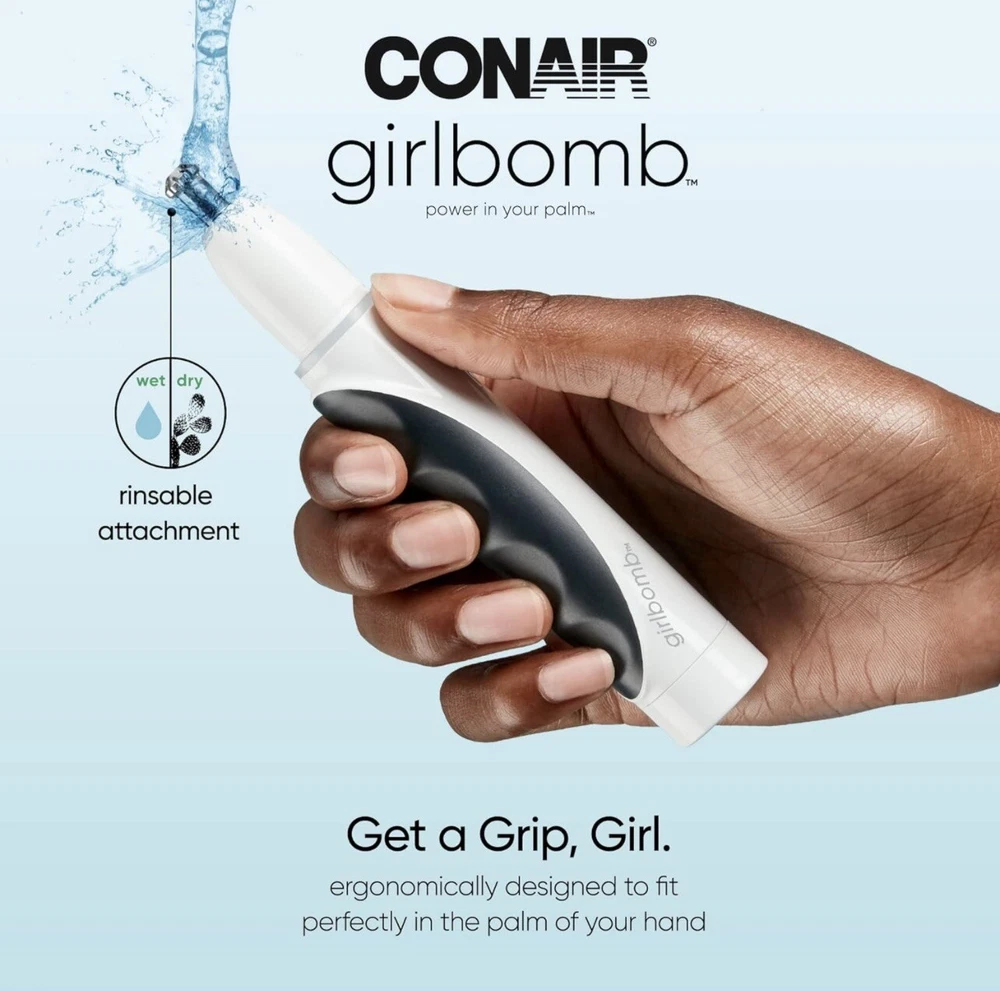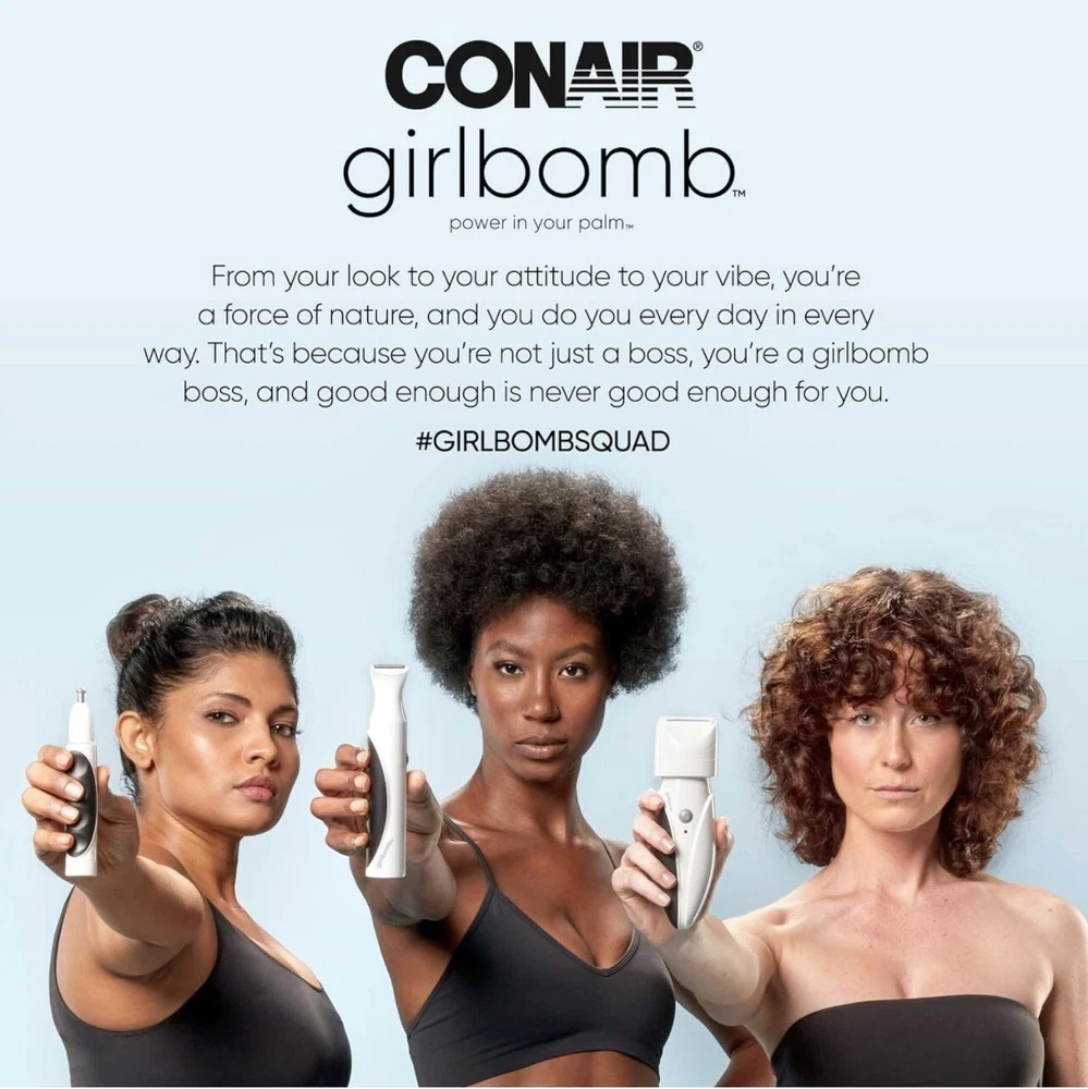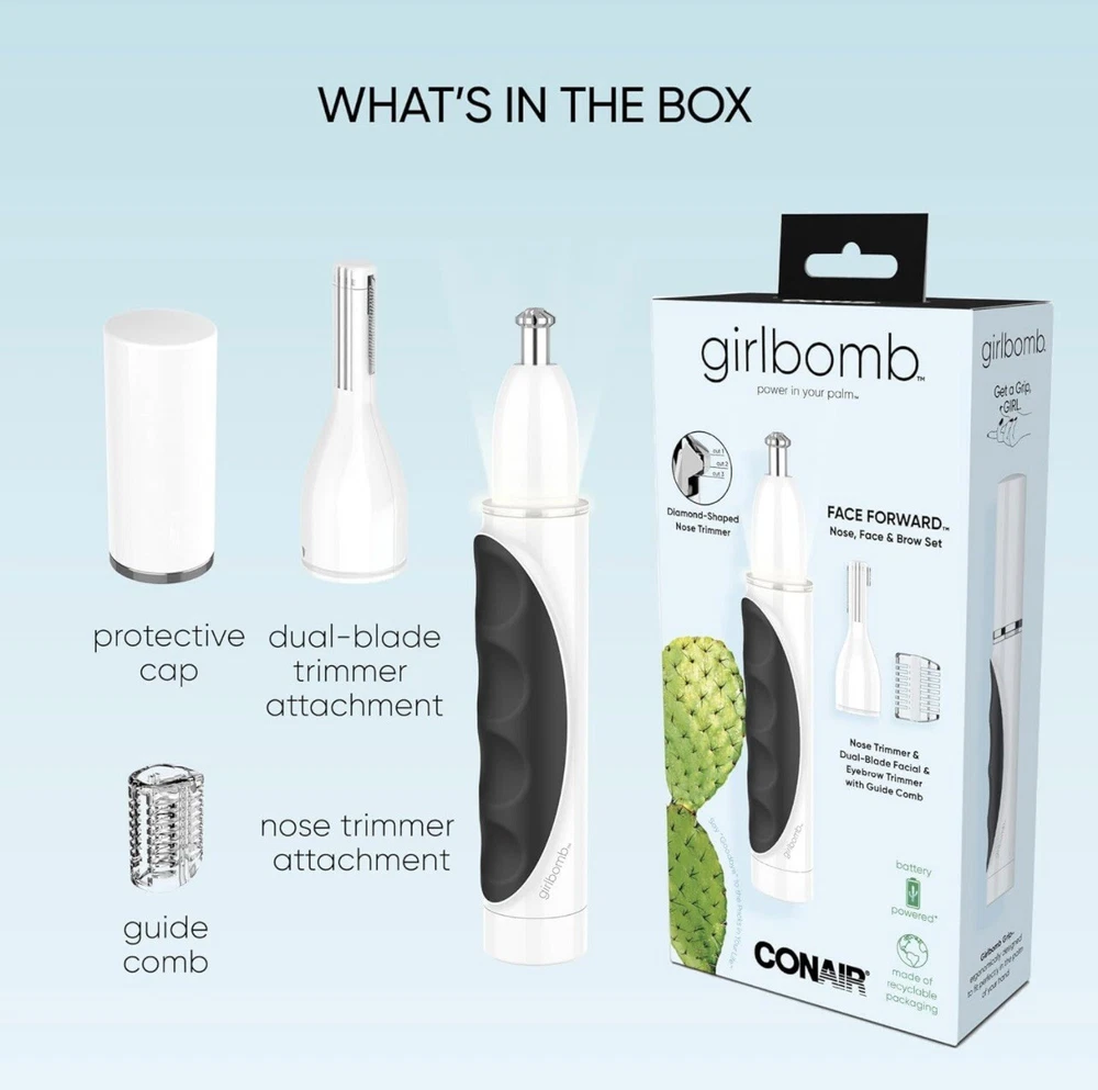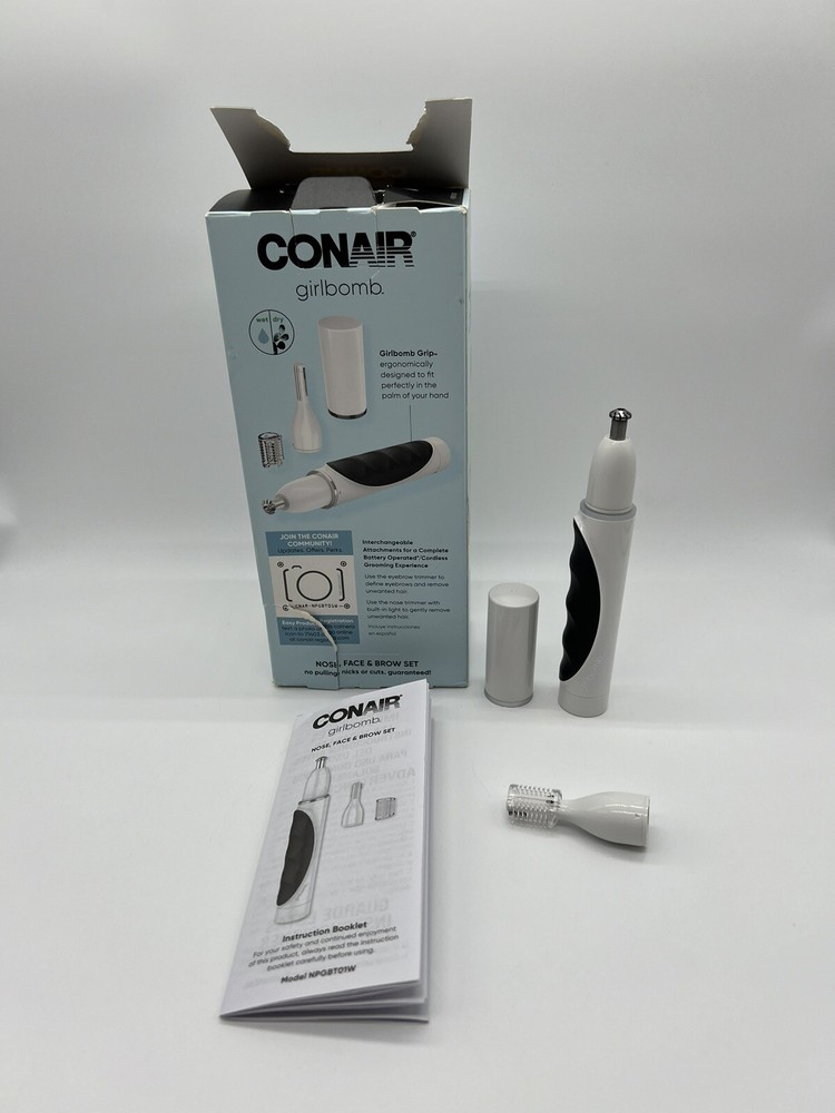 Conair Girlbomb Nose Trimmer Dual Blade Facial Eyebrow Guide Comb Battery Power. It’s brand new, open box! Item: P3 3-in-1 Ladies Trimmer: The battery-powered GIRLBOMB Face Forward Nose, Face & Brow Set is all you need for precision grooming that matches your attitude. Ladies Nose Trimmer: No pulling, nicks, or cuts, guaranteed. Our patent-pending Diamond-Shaped 360 degree beveled blade technology gently removes unwanted hair. Built-in LED halo light illuminates even the finest hair. Dual Blade Face and Eyebrow Trimmer: Remove hair on your face and shape and define your brow arches. The guide comb adds a precise touch that makes it easy to get your brows just right. GIRLBOMB Grip: the grip of all Conair GIRLBOMB products are ergonomically designed to fit perfectly in the palm of your hand. GIRLBOMB boss—safely, easily, and precisely: Designed for the girl who expects the best and gets it, this 3-in-1 trimmer makes it easy to trim nose and facial hair, shape and define your brows, and look GIRLBOMB boss beautiful.