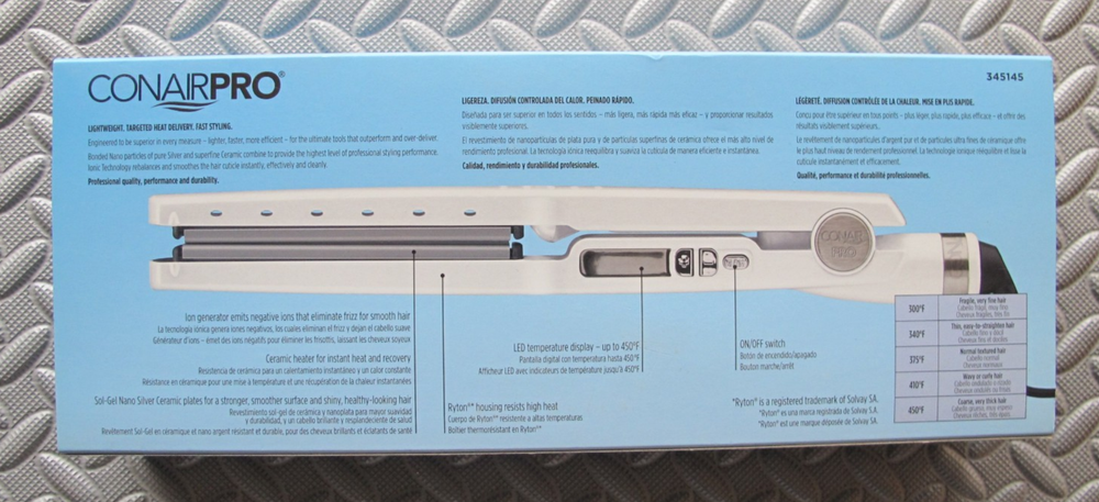 Conair Pro Nano Silver Ceramic Tools Ionic Straightening Iron, 1 3/4 Inch New, unused, open box item. Has 50 different heat settings Ideal for any hair type Creates less frizz with its ionic made plates