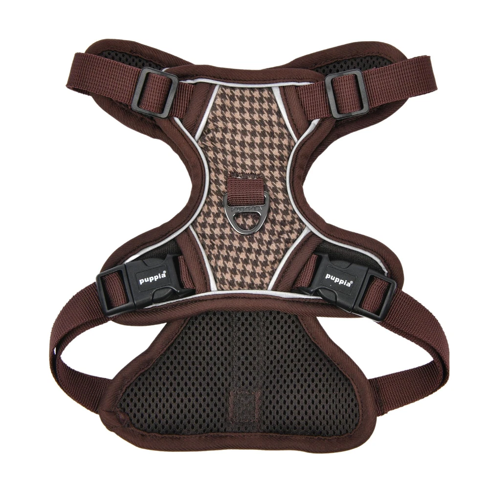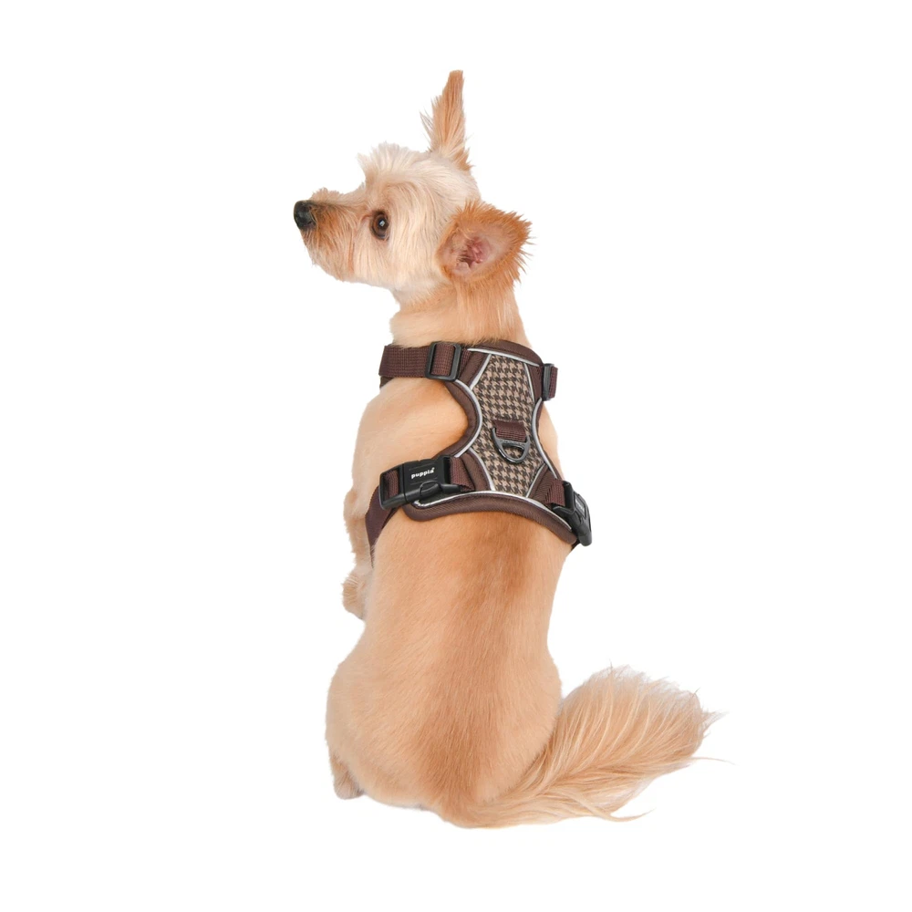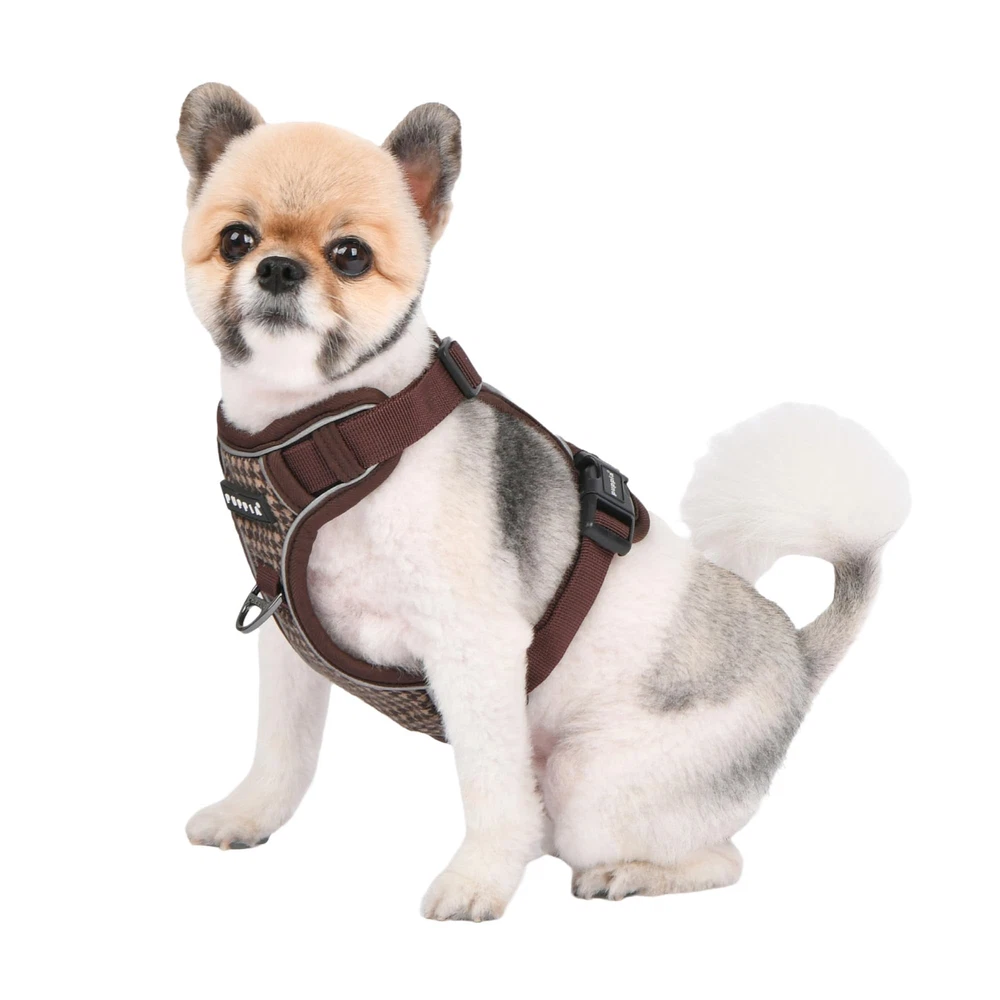 The Conall Harness H features a houndstooth pattern and solid schemed, Reflective straps, and Front and Back D-rings for lead attachment. It is a sturdy dog harness that is adjustable neck and chest with a buckles and straps and rubber label on the chest. Available in Brown and Black in sizes ranging from Small to XX-Large. New H style harness as "Harness H" Houndstooth pattern and solid schemed Front and Back D-rings for lead attachment Adjustable neck and chest with a buckles and straps & Reflective straps Size: Small: 7.9"~10.9" Neck, 12.9"~15.2" Chest, 4.3" Product Length