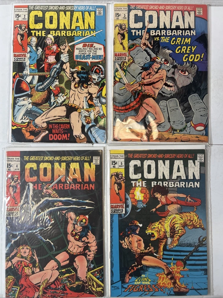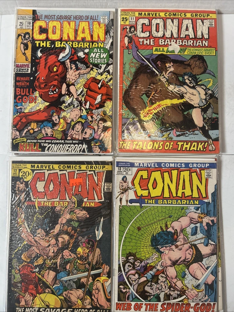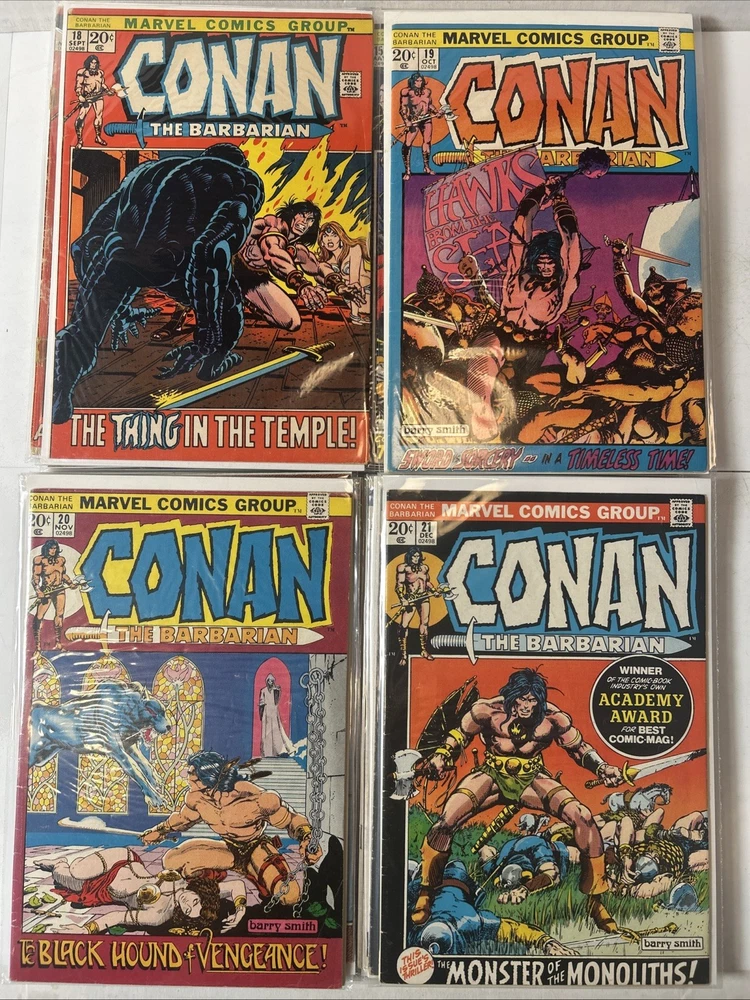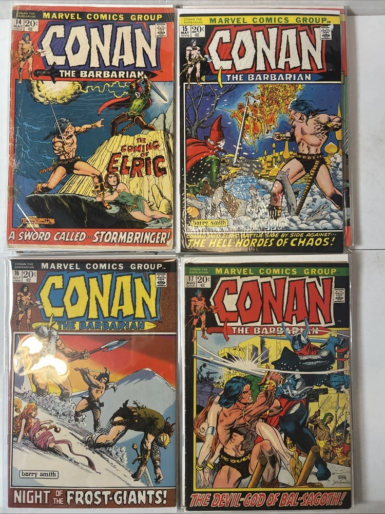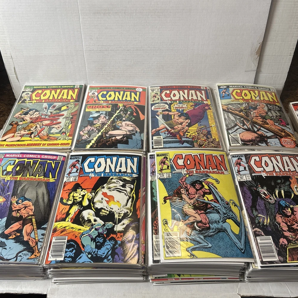 Complete Run With All Annuals and Giant Sizes, including all the early Barry Windsor Smith issues. #24 First Full Red Sonja is High Grade. Nice Overall Condition on most books The product is a complete collection of Conan the Barbarian comic books, including issues #1-275 and annuals 1-12, all published by Marvel Comics starting in 1970. The series features the character Red Sonja and takes place in the universe of Conan the Barbarian. These classic US Comics offer readers a thrilling adventure with iconic illustrations and engaging storylines, making them a valuable addition to any comic book collector's library. 1 FN 6.0 2 FN + 3 VG 4 FN+ 5 VF- 6 FN+ 7 FN+ 8 VG+ 9 FN/VF 10 FN- 11 VG+ 12 VG+ 13 FN+ 14 FN 15 FN+ 16 VF 17 VG 18 FN 19 VF- 20 VG+ 21 VG+ 22 FN 23 FN+ 24 VF 8.0 25-100 Mostly VG-VF 101-275 Mostly FN/VF-NM Annual 1 FN- Annual 2-12 FN-VF+ Giant Size 1 VF, 2 VG+, 3 FN, 4 FR (spine split), 5 VF Bagged and boarded
