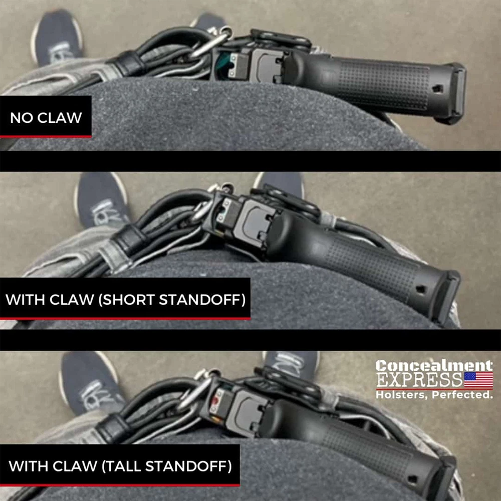 Eliminates Printing of Your CCW: Say goodbye to printing forever with our inside-the-waistband and tuckable claw kit; our gun holster claw attachment angles the butt of your gun in towards your body to eliminate any printing, giving you maximum concealability with your concealed carry weapon Precision Craftsmanship: 100% made in the USA, our holster claws are formed over our proprietary, precision aluminum molds; CAD-designed and milled in house, we ensure top quality, durability and fit for every claw we make Custom Design & Fit: Built to fit your Concealment Express holster, our claw accessory can be installed in seconds; it works with both right and left handed IWB & tuckable holsters with double hole retention (with .60” spacing). The Claw is built for Rounded by Concealment Express holsters and may not be compatible with other holster brands. All the Hardware You Need: This concealment claw kit includes 1 reversible claw base, 1 short claw standoff, 1 tall claw standoff, 1 flat screw, 1 nut, 4 rubber spacers, 2 short pan head screws and 2 long pan head screws