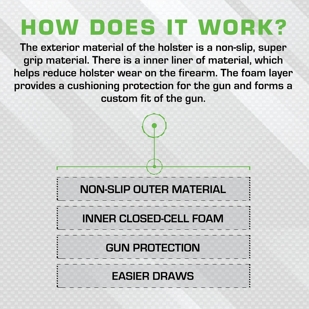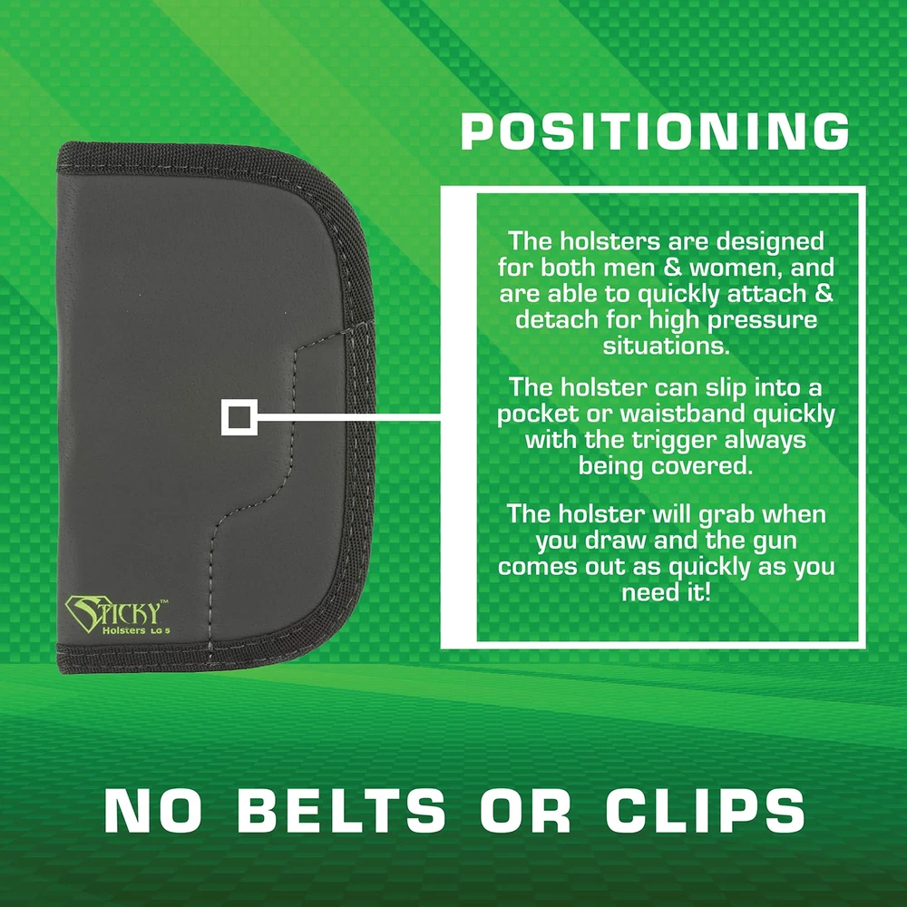What is a Sticky Holster? Since our inception, we have developed these holsters into a modular system, where you can use them IWB, in your pocket, on your ankle using our ankle rig, and for police officers, on your tactical/armored vest, etc. They don't come with clips or loops to secure them in place, as the outer "sticky" skin adheres to your waistband, undergarments and/or your skin. The outside skin is a super non-slip material that, with a little pressure, adheres to just about anything. That outer material combined with the inner closed-cell foam and the inner liner keeps your and the holster securely in place. In the pocket, it works like any other pocket holster. However, when you pull the , the outer layer grabs the inside of your pocket. Our modular products use the same "sticky" material against itself to hold the holster and in place. In addition, with use and body heat, your Sticky Holster will conform to your particular , making a custom fit. LG-5 LARGE is designed for large/long revolvers up to 4” barrel. It has an ambidextrous fit for both right and left-handed users. LG- 5 LARGE fits the Following : *Taurus Judge 45COLT 3 *Taurus Tracker 44MAG 4 *Taurus Tracker 357MAG 4 *Taurus Ultralite 44MAG 4 , Inc. stands by the quality of our holsters and accessories, which are 100% made in the USA. This IWB pouch features a high-performance, non-slip material that cleaves firmly to your skin and clothing, allowing it to stay in place reliably, even in dynamic situations. Furthermore, the inner layer is made of closed-cell foam that provides a snug fit that keeps your firmly in place. The LG-5 Large is designed to fit large/long revolvers, SAR .357, Taurus Tracker (large), Taurus Ultralite, and similar up to 4" barrels. It has an ambidextrous design that caters seamlessly to both left-handed and right-handed users, allowing for an effortless draw, regardless of your dominant hand. The concealment holster for pistols offers the ideal solution for discreetly carrying your sidearm, whether inside the waistband or in your pockets. Its unique design allows you to carry your effortlessly in a variety of clothing such as sweatpants, yoga pants, jeans, or virtually any apparel, with minimal printing and no bulky feeling. Say farewell to clips and loops. The revolutionary design of the LG-5 Large ensures that nothing gets in your way when drawing your firearm conveniently, especially in the most crucial situations. You can be confident that your holster stays in place with its non-slip material that adheres to your waistband, undergarments, or your skin. , Inc. stands behind the craftsmanship of our premium products. Every aspect of our products, from design to manufacturing, is handled with great attention to detail, ensuring the highest standards of quality. We take pride in the fact that all our products are proudly made in the USA, a testament to our commitment to supporting local craftsmanship and delivering durable products to our valued customers.