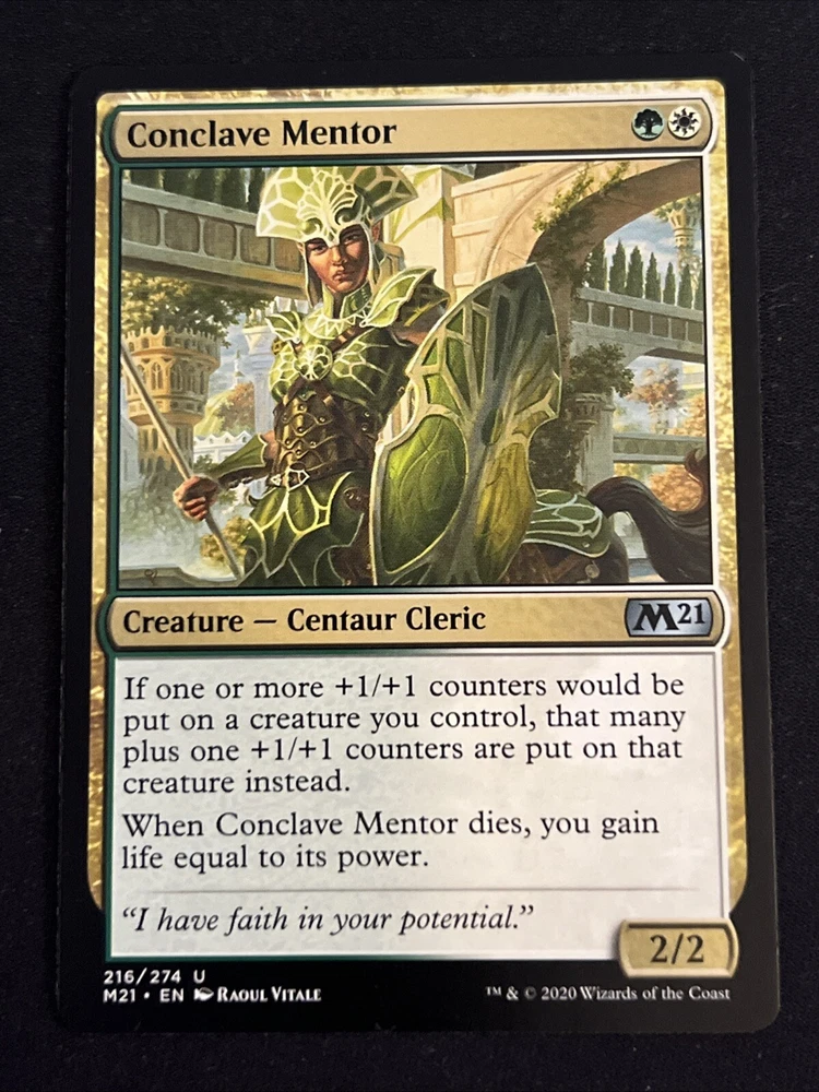When Conclave Mentor dies, you gain life equal to its power.Attribute/MTG:Color:White, GreenSet:Core Set 2021
