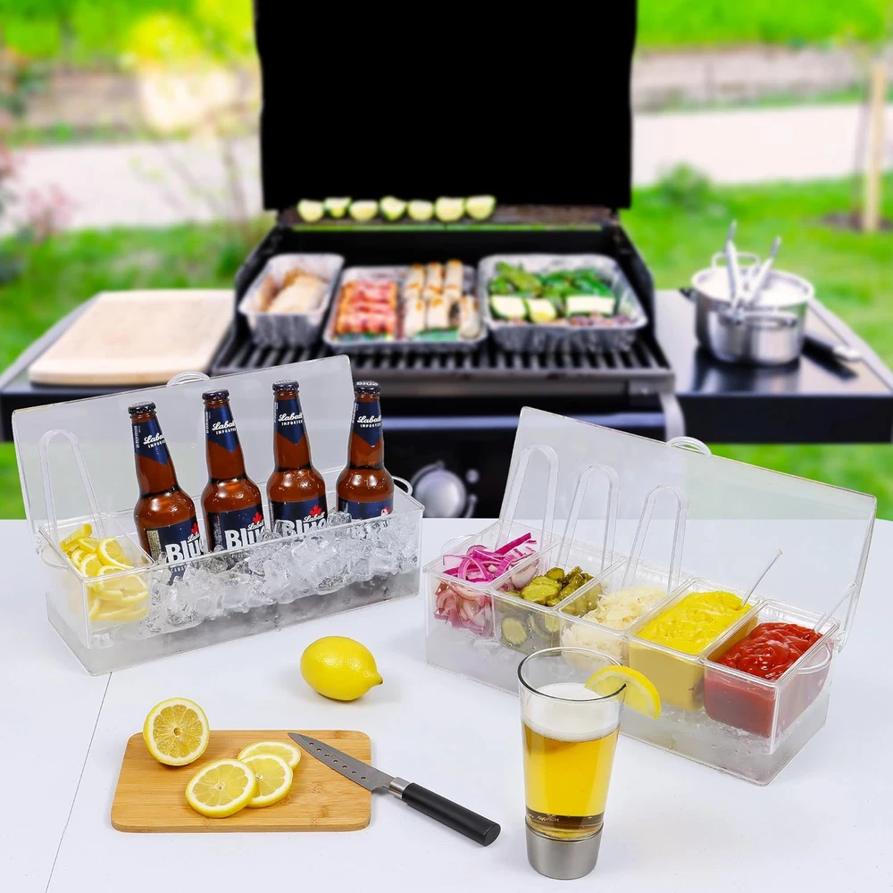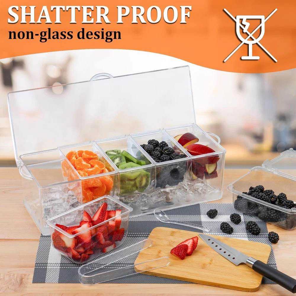 Condiment Caddy with 5 Removable Containers 2.5Cup Tongs/Spoon Set Great Garnish ICE COLD FRESHNESS: Keep your food fresh with the Joey'z condiment organizer! The lower compartment of the condiments organizer holds ice to keep toppings, sauces, dips, vegetables or fruits fresh and succulent for hours. The condiment tray's lid insulates the container, keeping your food cool, covered, protected, and fresh! The serving tray's NON-GLASS SHATERPROOF design makes ideal for pool decks, beach parties, and other barefoot settings. 5 REMOVABLE COMPARTMENTS: Our condiment container has 5 removable 2.5 cup containers allowing you to serve a full array of toppings, vegetables, dips, candy, and more! Individual compartments can be removed for quick refilling, easy cleaning, and easy fridge storage. MULTIPURPOSE: This versatile condiment dispenser is perfect for family gatherings, picnics, tailgates, BBQs, and indoor/outdoor/birthday party food display. It serves as a convenient hot dog or pizza toppings station, a stylish bar garnish caddy, a vegetable and fruit tray, and a taco bar serving set. Its clear, sleek design compliments any pool bar, buffet, mimosa bar or prep deck. MADE TO SERVE: Crafted from durable BPA FREE, PHTHALATE FREE food safe and freezer safe PS plastic, our bar caddy is made to to fulfill your serving needs. It also INCLUDES three (3) serving spoons, and three (3) serving tongs , providing everything you need to serve! LARGE CAPACITY: Measuring 15"x5.5"x5", the large capacity of our chilled serving tray allows you to stock it with a full day's worth of condiments. The individual cups measure 5.5"x3"x3" and are large enough to fit sliced vegetables, cut fruit, ACCESSORIES INCLUDED: Includes three (3) serving spoons, and three (3) serving tongs Product Description Ice Chilled Condiment Caddy Introducing our innovative Chilled Condiment Caddy, a great solution for keeping your favorite condiments fresh and ready to serve at any gathering or event. Crafted with convenience and versatility in mind, this caddy features a clever design that ensures your condiments stay chilled for hours. At the base, a spacious ice compartment provides a reliable cooling effect, maintaining optimal temperatures without compromising on flavor. Many Uses Our caddy features 5 cups for condiments like mustard, ketchup, relish, mayo, & sriracha. It's perfect for toppings like onions, jalapeños, pickles, and tomatoes, as well as garnishes such as cilantro, cheese, bacon bits, & croutons. Need snacks? Fill the cups with nuts, olives, pretzels, or candies. Whether it's a barbecue, picnic, or party, our caddy ensures everyone can customize their dishes. Serving Utensils Included! Our Chilled Condiment Caddy comes with three serving spoons and three tongs, offering added convenience for serving toppings and garnishes alongside your condiments. With these included utensils, hosting a barbecue, picnic, or party becomes even more effortless, allowing your guests to customize their dishes with ease. Includes: Condiment Caddy w/ 5 Removable Cups 3 Serving Spoons 3 Serving Tongs Great For: Serving Chilled Fruits, Vegetables & Crudités Salad Bar Toppings & Condiments Picnic Caddy Condiments BBQ Caddy for Ketchup, Mustard and Hotdog & Hamburger Toppings Dips, Sauces & Dressings Bar Accessories & Snacks Mimosa Bar Supplies Taco Bar Serving Set for a Party Innovative Ice Chamber Having the ability to place the contents of our Chilled Condiment Caddy on ice offers numerous benefits for your gatherings and events. By keeping condiments, toppings, and garnishes cool and fresh, you ensure that they maintain their optimal flavor and texture throughout the duration of your gathering. This not only enhances the overall dining experience for your guests but also reduces the risk of spoilage, ensuring food safety. Additionally, the chilled condiment caddy provides a refreshing touch to dishes, particularly on hot days, adding to the enjoyment of outdoor events such as barbecues or picnics. With our chilled condiment caddy, you can host with confidence, knowing that your condiments and accompaniments are always at their best. Non-glass Shatterproof Design Great for the Pool Side Our Chilled Condiment Caddy offers distinct advantages by being crafted from PS acrylic rather than glass, particularly for use around pool areas. The lightweight and durable nature of PS acrylic ensures easy handling and transport, reducing the risk of breakage and potential accidents, making it ideal for outdoor settings. Unlike glass, PS acrylic is shatter-resistant, providing peace of mind when used around poolside environments where safety is paramount. Additionally, PS acrylic maintains excellent clarity and transparency, offering an elegant presentation for your condiments and accompaniments while withstanding exposure to outdoor elements. Its resistance to discoloration and UV damage further ensures long-lasting durability, making our caddy a reliable choice for poolside gatherings and outdoor entertaining. Plus, it's BPA and phthalate-free, ensuring your health and safety are prioritized alongside convenience and style. Its Not Just for Condiments With its multifunctional design, our Chilled Condiment Caddy is the ultimate versatile accessory for any gathering. Beyond its primary purpose of serving condiments and toppings, this caddy offers a myriad of practical uses. Remove the cups, and it transforms into a spacious ice , ideal for keeping beverages frosty and refreshing. But its versatility doesn't stop there. You can also utilize it to keep other food items cool during transportation, ensuring they arrive fresh and ready to enjoy at picnics, barbecues, or tailgates. From serving condiments to chilling drinks and transporting snacks, our Chilled Condiment Caddy effortlessly adapts to meet your diverse needs, making it an indispensable addition to any event. Dimensions Serving Spoons and Tongs Included! Serving spoons and tongs included—ready 