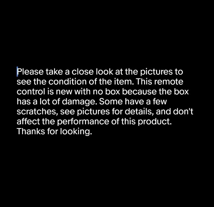 Please take a close look at the pictures to see the condition of the item. This remote control is new with no box because the box has a lot of damage. Some have a few scratches, see pictures for details, and don't affect the performance of this product. Thanks for looking.