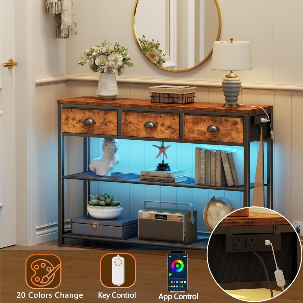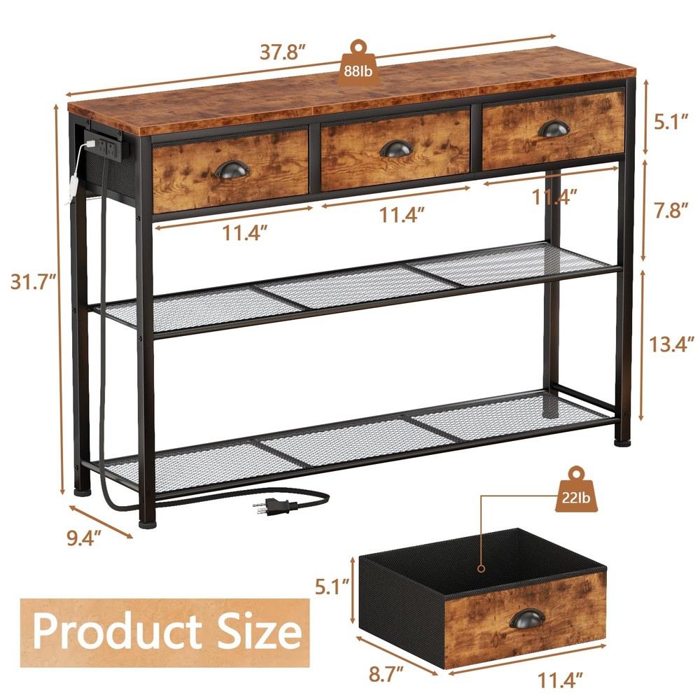 Console Table with Charging Station & 3 Fabric Drawers, 38'' Entryway Table with Storage Shelves and LED Light, Industrial Foyer Table for Entry Way, Display Shelf for Hallway, Rustic Brown Convenient Power Outlet & LED Light: The entryway table with storage drawers also equipped with 2 power outlets and 2 USB charging ports for your devices, makes it easy and convenient to charge your smartphone, gaming device or Bluetooth device. It can be installed on the left or right side as required. The LED light provides 20 changeable colors, 22 dynamic modes, 5 adjustable brightness levels, and 10 flicker frequencies. 3 Upgraded Fabric Drawers: The console table for entryway features easy-pull arch handles and 3 storage drawers, console table with drawers are made of high quality non-woven fabric that is lightweight, breathable, dustproof and provides ample storage space to keep your essentials organized and within reach. Sturdy & Stable Structure: The Long 38'' sofa table is made of high-quality particleboard and a durable metal frame for enhanced sturdiness and a load capacity, making it a reliable piece of furniture for your living room. Foyer tables for entryway is equipped with adjustable feet to help stabilize on uneven floors or carpets. Multi-functional Table: This versatile table also can be used as an accent table, couch table, foyer table, entrance table, bar table, display shelf, front door table, TV stand, plant stand, window table, coffee bar table station, hallway table for bedroom, Living room, kitchen, complementing various home décor styles. Space-saving Solution: Designed with a small footprint, this narrow console table is ideal for apartments or rooms with limited space. Its sleek and slim profile allows it to fit seamlessly into any corner, providing both style and functionality without taking up valuable floor space. 2 tiers open mesh shelves which good for heat dissipation, you can placing the DVD, TV BOX, XBOX, or other entertainment accessories.