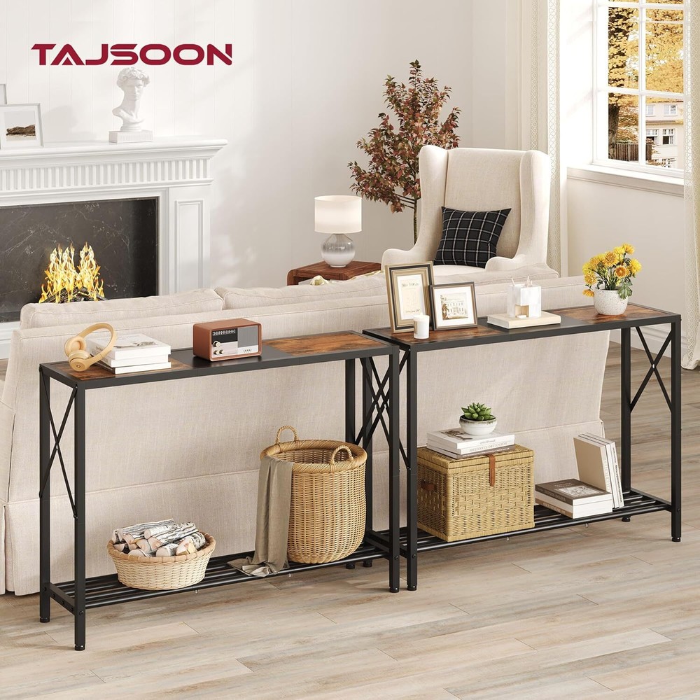 【Narrow Console Table 】 Our sofa table creats more storage space for you. Perfect size at 41.8”L x 11.5”W x 30.2”H, you can put it in any narrow place. 【Sturdy & Durable】hallway foyer table is made of spliced-colored wood and heavy duty metal, sturdy enough to offer a long service life. The additional X-shaped frame strengthens the stability of the entrance table greatly. 【Easy to Assemble】Clear and detailed instructions, and numbered parts are included in the package to ensure you assemble this hallway table quickly and easily. 【Safety First】The behind couch table features 4 adjustable footpads to prevent shaking on uneven surface and protect your floor from scratches, which make the hallway table stable and safe to use. 【Multifuction】The entryway table with storage can be placed in the entryway, hallway, living room, couch, kitchen etc. Furthermore, the TV console table can be used as sofa table to place green plants, scented candles, meeting your different needs. 【Reliable】The top panel is made of FSC-Certified wood
