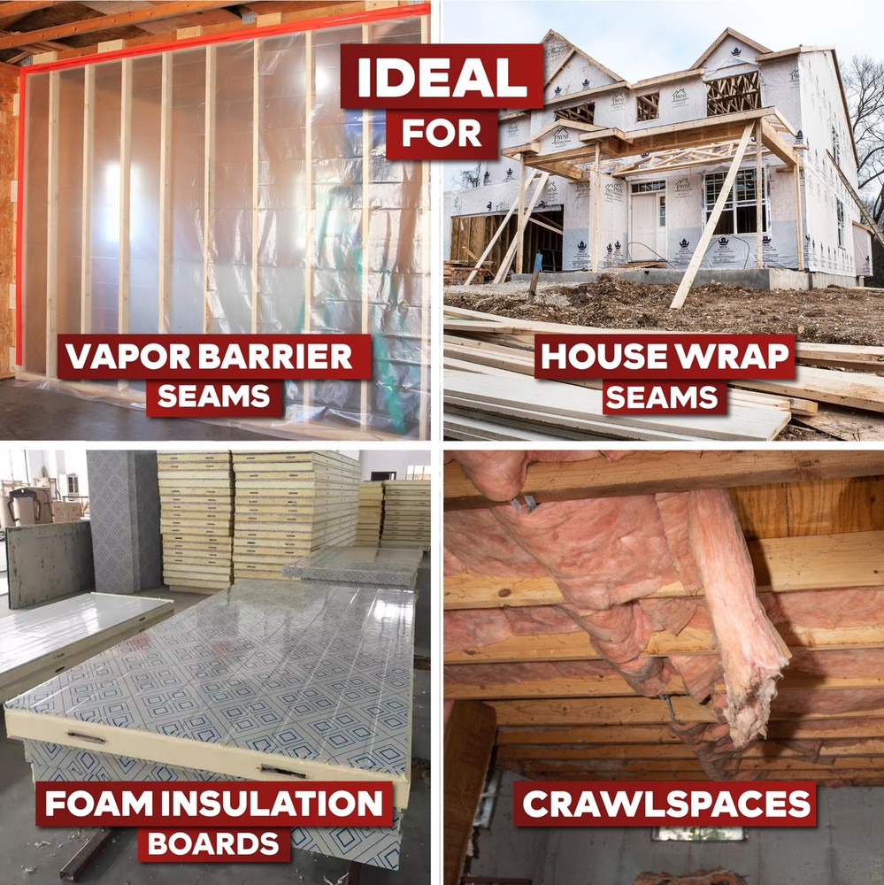 The Red Seaming Tape is a heavy-duty and all-weather construction tape built to last and withstands high humidity and extreme temperature (-4°F to 203°F). It sticks to all building material types- foam insulating boards, polyethylene sheets, house wrap, vapor barrier sheet, tile, wood, ceramic, concrete, roofing materials, and even epoxy resin. Why Choose the Red Construction Sheathing Tape? ● BUILT TO LAST. With a puncture and abrasion-resistant body, curling, and lengthwise-splitting resistant fiberglass backing, and weatherproof adhesion, the Red Construction Seaming Tape is designed to take a beating without falling off and maintaining its sealing properties to your vapor barrier sheets. ● MADE FOR BEGINNERS, FOR PROFESSIONAL PROJECTS. Say goodbye to clunky house wrap tapes that are difficult and messy to apply. Its non-stick outer layer prevents epoxy resin from sticking, making it a formidable epoxy resin tape. This tape produces neat and professional-looking finishes on crawlspace and vapor barrier film seams and joints. ● DOES NOT SPLIT AND BREAK UNNECESSARILY. Many red construction sheathing tapes on the market are too thin to the point that they often split lengthwise. When this happens, you will go through the hassle of slowly and meticulously working through the split tape until you get an unsplit piece, cut the end off, and only then can you resume your work. We solved this by incorporating a fiberglass middle-layer on the tape, allowing for optimal thickness while preventing the tape from splitting, breaking, or curling midroll. ● EASY TO PEEL AND STICK FOR FASTER APPLICATION. Best used by professionals and contractors as our tape is equipped with a quick-release adhesive backing, which allows for faster peeling and sticking- such that you can save time and instead focus on more crucial tasks. Durable and weather-resistant: Construction seaming tape is designed to withstand harsh weather conditions, making it an ideal choice for sealing seams and joints in building envelopes, roofs, and other construction applications. Its durable and weather-resistant properties ensure long-lasting protection against moisture, wind, and dust. Easy to apply: Construction seaming tape is easy to apply thanks to its pressure-sensitive adhesive that bonds quickly and securely to various surfaces, including concrete, wood, metal, and plastic. It can be applied by hand or automated dispensing equipment, saving time and labor costs. Versatile: Construction seaming tape suits various applications, from small repairs to large-scale construction projects. It can also be used on various substrates, such as vapor barriers, insulation, and ductwork. Cost-effective: Construction seaming tape is a cost-effective solution for sealing seams and joints in construction applications compared to other sealing methods. It requires minimal preparation and cleanup, making it a quick and easy solution that saves time and money. Compliant with industry standards: Construction seaming tape is designed and tested to meet industry standards for performance and durability, ensuring that it meets the strict requirements of building codes and regulations. It is an important component of building envelopes and air barrier systems, helping to achieve energy efficiency and sustainable building practices.