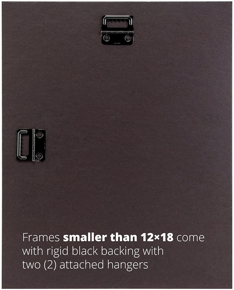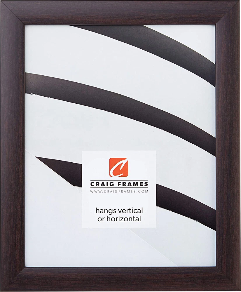 Traditional style; dark brazilian walnut brown; smooth wrap finish Frame includes: glass, rigid black backing and pre-attached stamped hanging hardware Frame holds a 8.5 inch by 11 inch photo/print (viewable area reduced by .25" on each side due to frame lip) Frame moulding is 1 inch wide; MDF wood composite Frame is designed for WALL HANGING only (hanging hardware allows for portrait or landscape orientation) Product Description Craig Frames | Ithaca, MI American-made & Trusted for Over 30 years Craig Frames offers hundreds of styles and sizes. Our products include picture frames, poster frames, photo frames, collage frames, document frames, framed maps, matting, bulletin boards, & more. A Trusted Brand & US Manufacturer Offering a Vast Selection of High Quality Home Décor Products Enjoy a vast selection of highly rated, affordable, professional quality picture frames and poster frames for wall hanging or table top use. Craig Frames also offers 2-Packs & 4-Packs for gallery wall sets, large art projects, or wholesale purchases. Styles include Modern, Rustic, Farmhouse, Boho (Bohemian), Ornate, Metallic, Weathered & Distressed, and more. Most frames are available in 30+ popular sizes, and many are available in 500+ custom frame sizes. With more than 45,000 Seller Ratings, thousands of customers continue to enjoy our American-made picture frames for their home décor projects. Living room, bathroom, kitchen, bedroom, nursery, or office; we're confident you'll find the perfect style and size for your decorative project or business needs. Visiting our Brand Store provides a simple, well organized, way to discover framing solutions for every project or occasion. (Click 'Visit the Craig Frames Store' above) Exceptional Value, Selection, Quality, and Service Styles Available Modern, Farmhouse, Contemporary, Rustic, Boho, Antique, Ornate, Weathered, Distressed, Metallic, Natural, & More Sizes Available Most frames are available in 30 or more popular picture frame sizes. 500+ custom frame sizes available in some styles.. Occasions Birthday, Mother's Day, Father's Day, Christmas, Graduation, Baby Shower, Home Renovation, Off to School, & More. Quality American-made in Michigan by professional framers with materials sourced primarily in the USA. Reputation More than 45,000 seller reviews supporting our quality craftmanship and service. Service US based support team providing real-time service & solutions. Our Promise to You We completely stand behind our products and service. Our goal is to ensure every framing project turns out just as you'd envisioned, and that your experience with us is a good one. If you aren't satisfied with your item, we'll gladly resolve any issue. Our team is always ready, and happy to help. Manufactured in Ithaca, Michigan All our products are made at our Ithaca, MI facility by our team of dedicated local employees. We source more than 96% of our Frame Mouldings and components from domestic suppliers. We take great pride in keeping our operations in the U.S.A. What Customers are Saying "Excellent service, safe packaging." "Actually arrived ahead of estimated delivery date" "Perfect frames for my antique posters! Very nice." "Amazing, better than I had envisioned." "Well packaged and arrived on time in perfect condition"