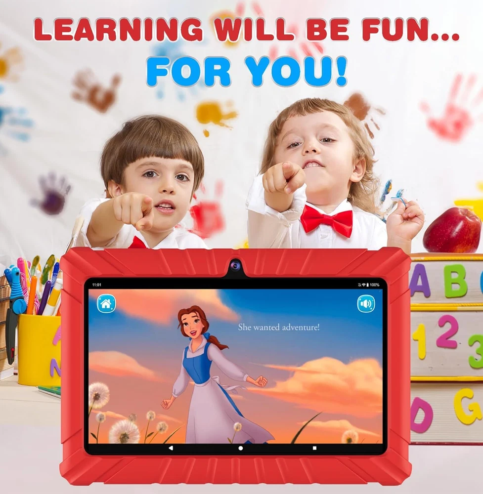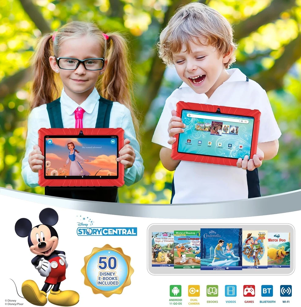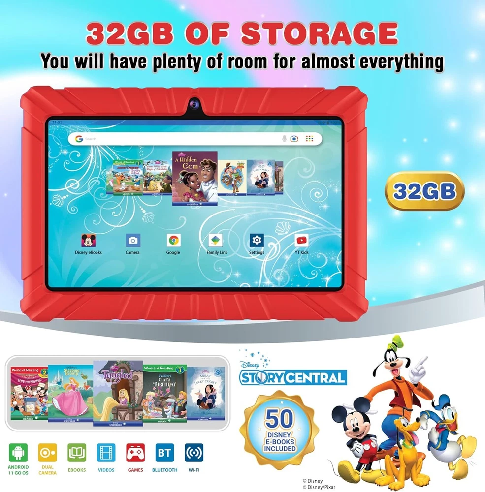 Contixo Kids Tablet V8-7-Inch HD Toddler with Camera, 32GB, Red Product Details Standing screen display size: 7 Inches Screen Resolution: 1024x600 Max Screen Resolution: 1024x600 Pixels Processor: 1.5 GHz arm710 RAM: 1 GB SDRAM DDR3 Hard Drive: 32 GB Flash Graphics Coprocessor: Mali-400 MP2 Chipset Brand: ARM Card Description: Integrated Wireless Type: 802.11bgn Average Battery Life (in hours): 10 Hours Brand: Contixo Model Name: v8-2 Memory Storage Capacity: 32 GB Screen Size: 7 Inches Display Resolution Maximum: 1024x600 Pixels 50+ DISNEY E-BOOKS INCLUDED: Pre-loaded Disney Digital Audio Books featuring favorites like "Olaf's Birthday" and "Toy Story 2" for endless storytime fun and learning. PARENTAL CONTROLS & SAFE BROWSING: Manage screen time, content, and app access via Google Family Link. Ensure a safe, age-appropriate online environment for your child. DURABLE & KID-PROOF DESIGN: Comes with a protective case and pre-applied screen protectors, offering peace of mind against drops and bumps. POWERFUL PERFORMANCE & STORAGE: Powered by Android 11 OS with a Quad-Core 1.5GHz CPU, 2GB RAM, and 32GB internal storage, expandable up to 128GB via MicroSD. CAPTURE MEMORIES & FUN: Equipped with a 2MP rear camera and 0.3MP front camera for creativity, photos, and video calls. Enjoy up to 4.5 hours of entertainment on a single charge.