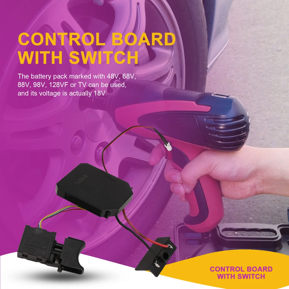 Control Board Switch for 2106/161/169 Brushless Electric Wrench Drive5832 The battery pack marked with 48V, 68V, 88V, 98V, 128VF or TV can be used, and its voltage is actually 18V (5 series 2 parallel 10 cells or 5 series 3 parallel 15 lithium batteries, fully 21V) . Before testing the machine, you must connect the wire---fix the motor---install the case---tighten the screw---make sure that the square shaft of the can be easily rotated without jamming---connect the power supply--- Press down the speed control switch so that there is no in the shell! Otherwise, there may be a buzzing alarm! The product is suitable for 2106/161/169 brushless electric wrenches. 18V 21V Brushless Angle Grinder Drive Plate Polishing For Machine Brushless sensorless angle grinder drive control board general Control board drive voltage: 18V (5 strings of lithium batteries, fully 21V), power 300W. Colour:Black Material:plastic Package Contents: 1 x Control board With Switch