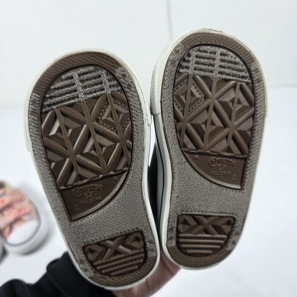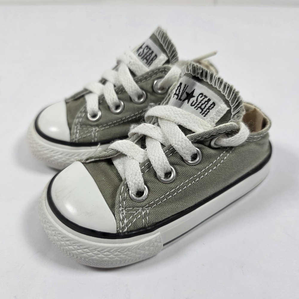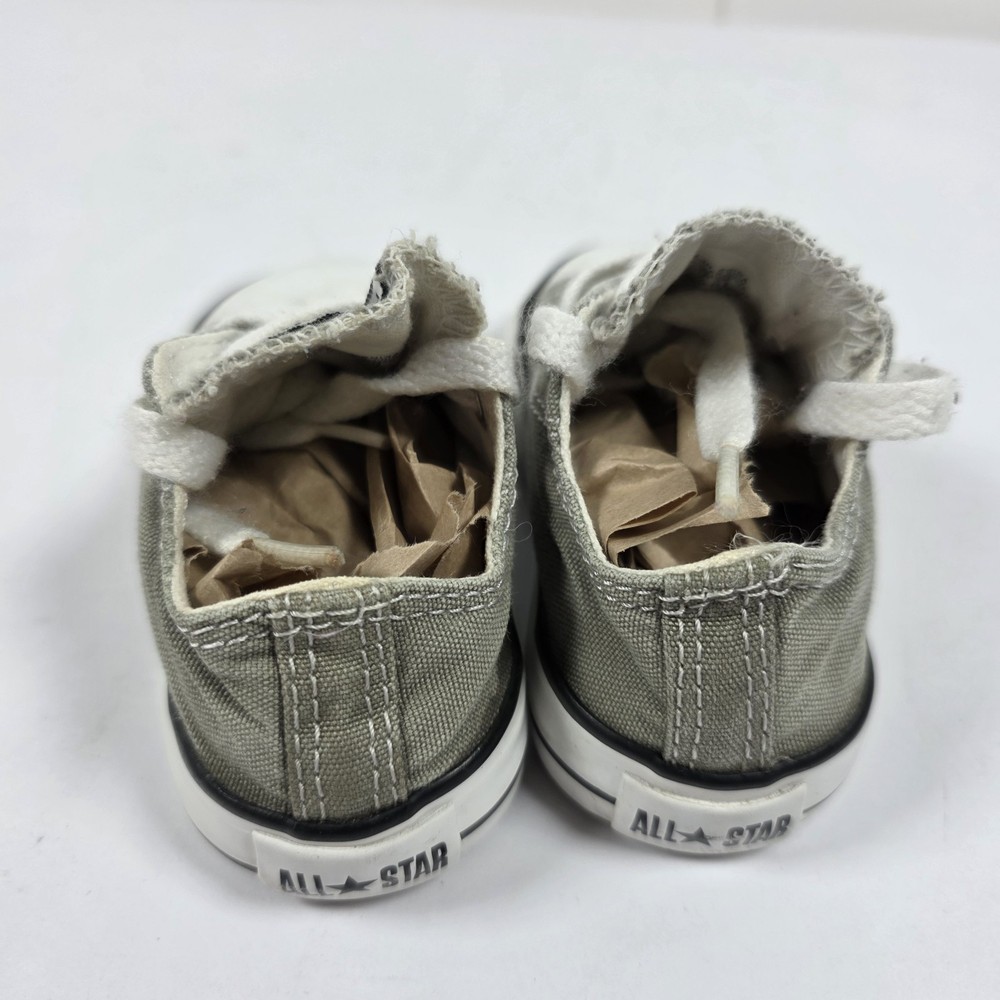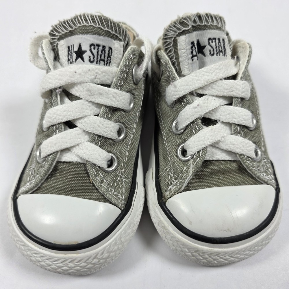 The Converse All Star Infant Baby Toddler Size 4 Gray Low Top Shoes Sneakers are stylish and comfortable sneakers perfect for your little one. Made of canvas with a rubber outsole, these lace-up shoes feature the iconic Converse logo and are ideal for casual occasions. The low-top design and moderate cushioning level provide support for your child as they explore and navigate. With a versatile gray color and a solid pattern, these sneakers are both practical and on-trend for any season. Perfect for walking and everyday wear, these Converse sneakers are a classic choice for your baby's wardrobe.