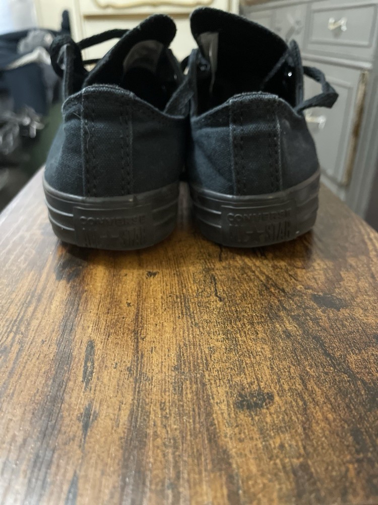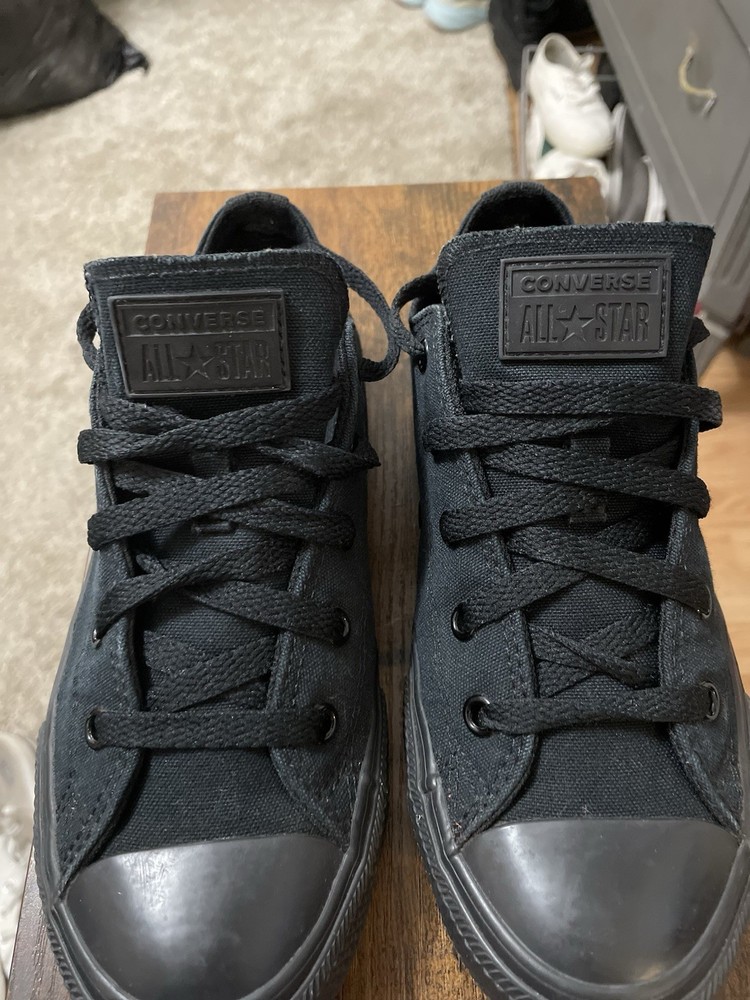 The product is a pair of Converse All Stars All Black Youth Size 3 Low Top Sneakers. These lace-up sneakers feature a round toe shape, flat heel, and rubber outsole for comfort and durability. The canvas fabric upper is accented with the iconic Converse logo, making them a stylish choice for casual occasions during the summer, fall, and spring seasons. This unisex kids sneaker is part of the Converse All Star product line and showcases a solid black color with a star theme, making it a versatile and classic addition to any wardrobe.