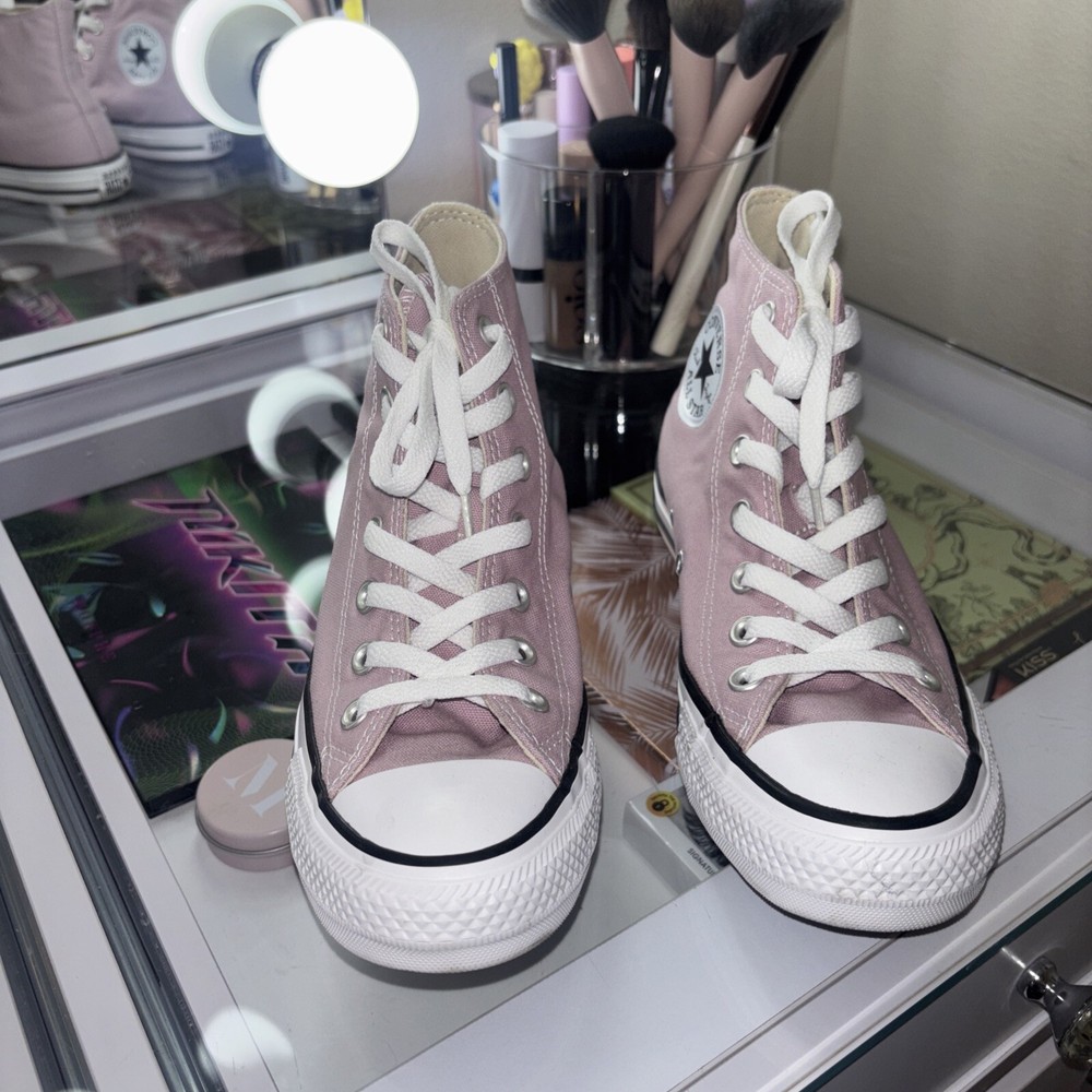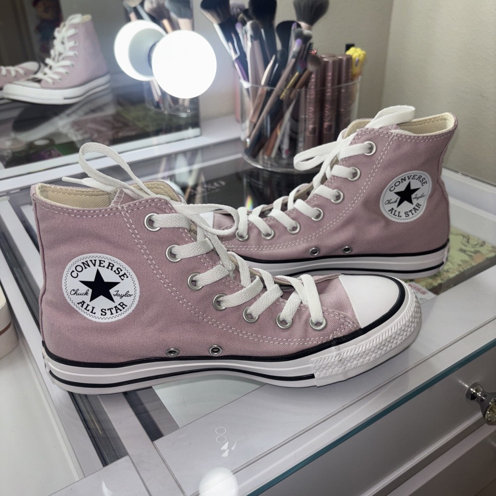 This is a pair of Converse Chuck Taylor All Star High sneakers in Phantom Violet color, featuring a suede upper material with a high-top shoe shaft style. The size is US 5 in Men ,The manufacturer color is listed as Phantom Violet/Egret/Phantom Violet, and the model belongs to the Converse Chuck Taylor product line. With a classic sneaker design and the iconic Converse branding, these shoes are a stylish and comfortable choice for casual wear.