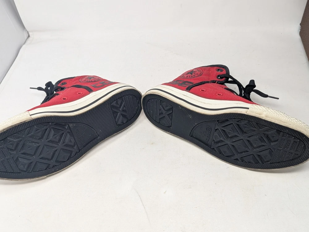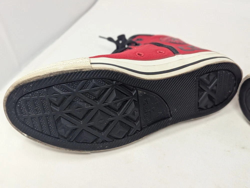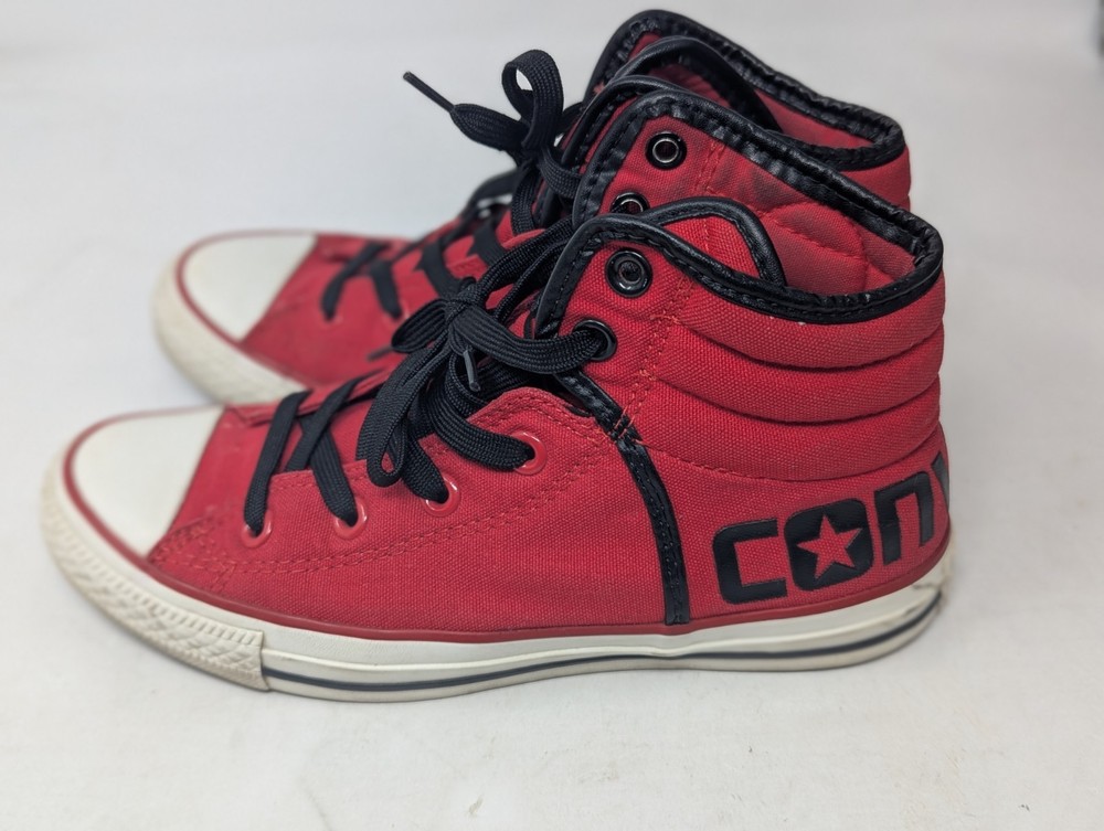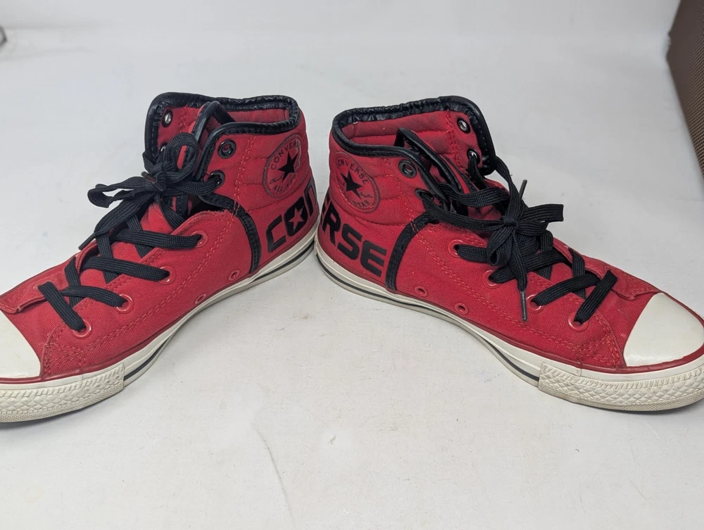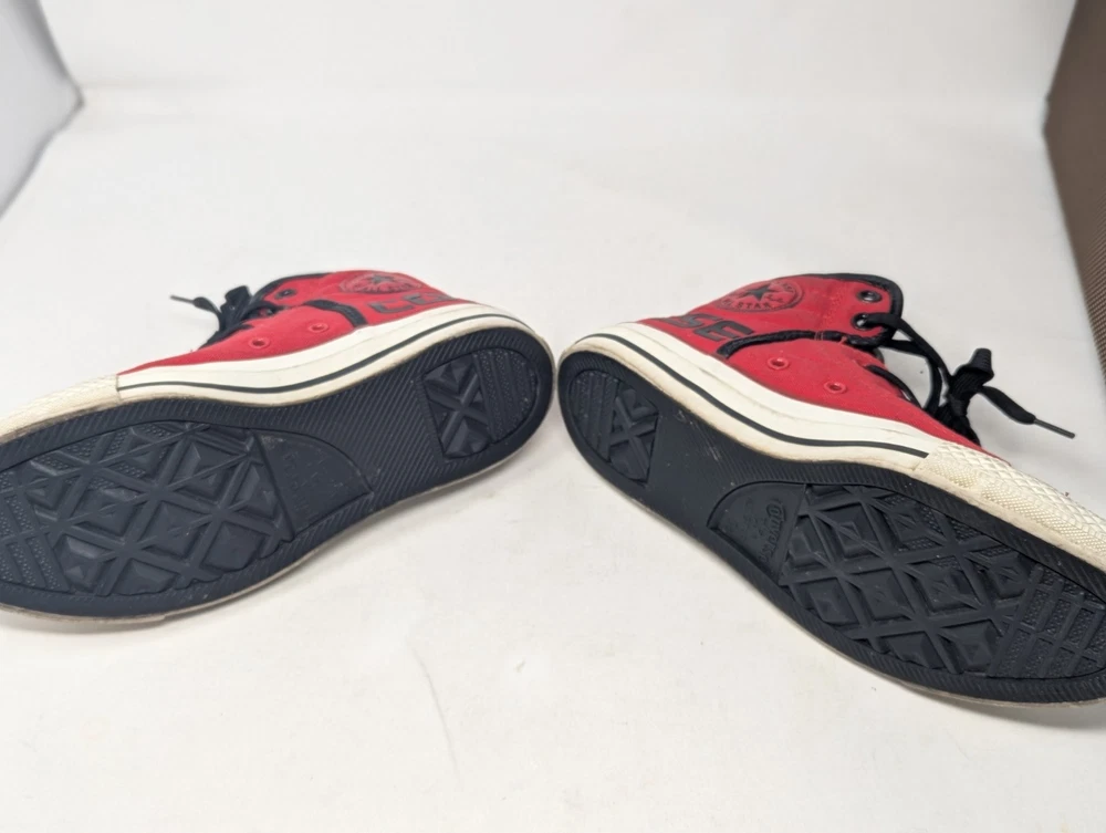 Converse Check Taylor All Star Red/ Black Accents Lace Up High Tops Kids Size 5.5. Unisex. Pre-owned but in Nice Used Condition. No major flaws. Minor surface marks and scuffs from wear. Soles are in Nice Condition. Padded on the back with Black CONVERSE Lettering. Padded Tongue. See pictures for details and conditions. Please message us with any questions. Ships with USPS Mail. Thanks for looking.