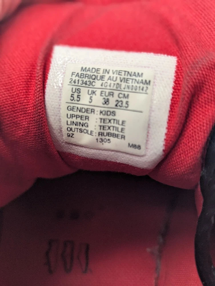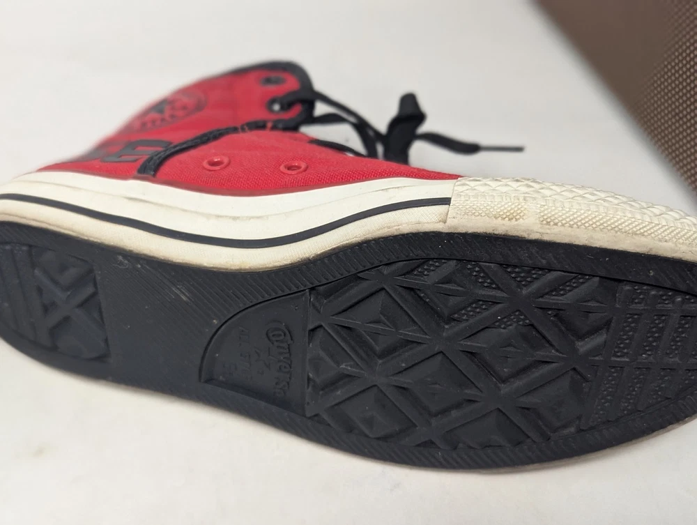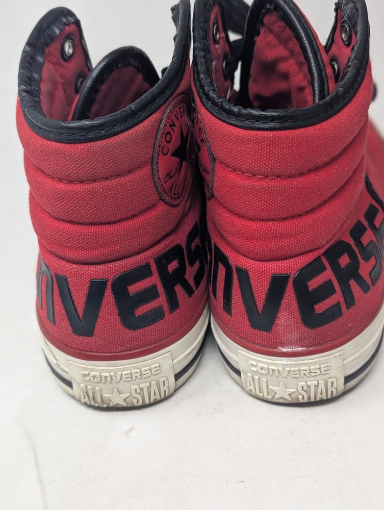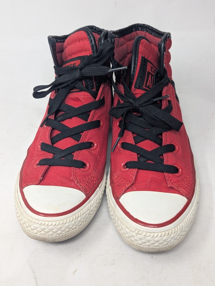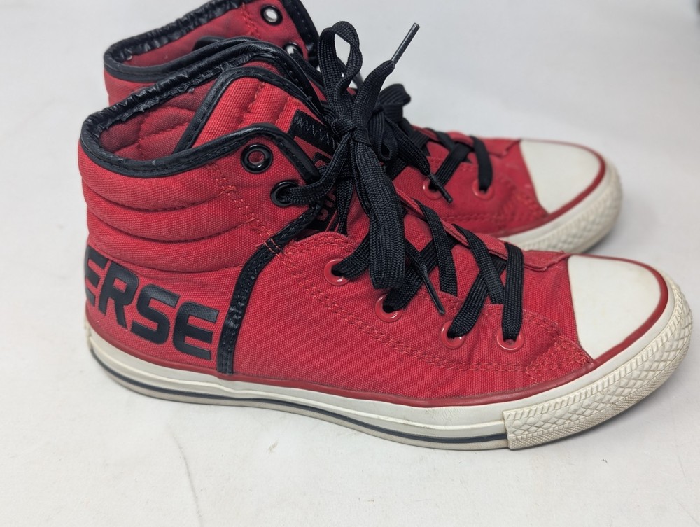 Converse Check Taylor All Star Red/ Black Accents Lace Up High Tops Kids Size 5.5. Unisex. Pre-owned but in Nice Used Condition. No major flaws. Minor surface marks and scuffs from wear. Soles are in Nice Condition. Padded on the back with Black CONVERSE Lettering. Padded Tongue. See pictures for details and conditions. Please message us with any questions. Ships with USPS Mail. Thanks for looking.