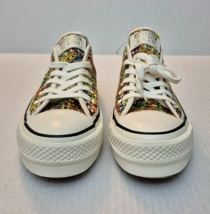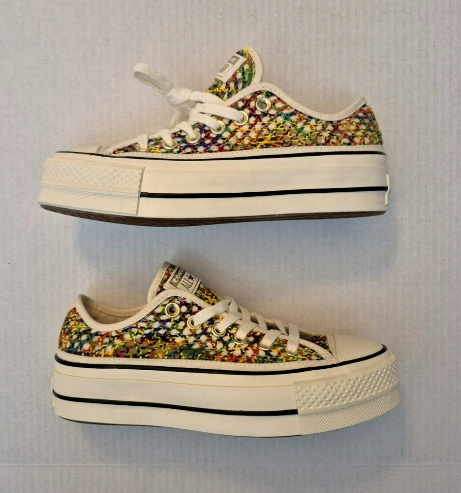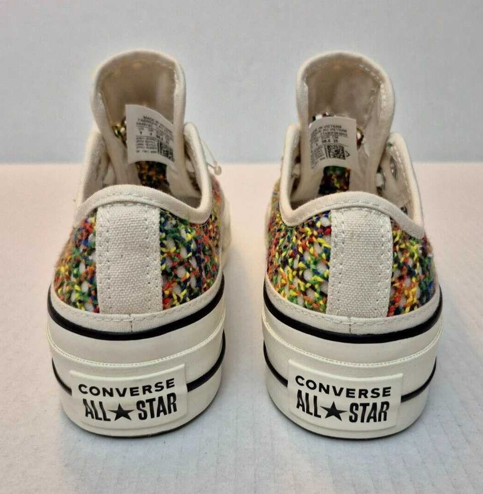 Converse Chuck Taylor All Star Lift Ox Multicolor Rainbow Platform Shoes - New Without Box Women's low-top sneakers with a lace-up closure and a unique rainbow pattern. It features a comfortable textile lining, rubber sole and a toe-cap design. This limited edition shoe is suitable for various occasions such as sportswear or casual wear. Perfect for walking, it offers breathability and a standard shoe width. Made in Vietnam, this shoe is part of the Converse Chuck Taylor All Star collection. NOTE: Please see the images to verify your purchase. Color may differ slightly due to lighting and screen quality. From a smoke-free, pet-free home. Please contact us if you need additional images or information to make your purchase. If you are happy with your transaction, please leave us a Positive Feedback. If you have any problems with your order, please contact us.