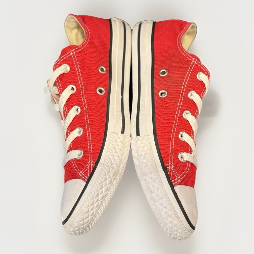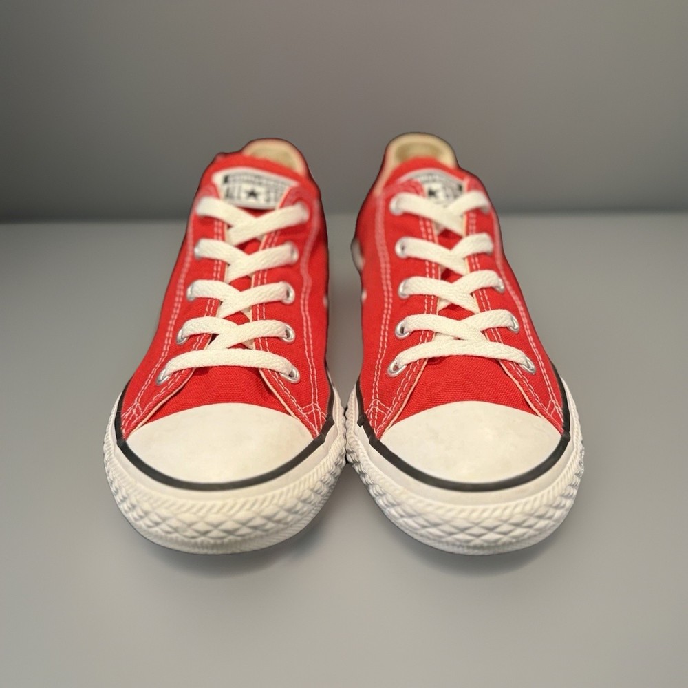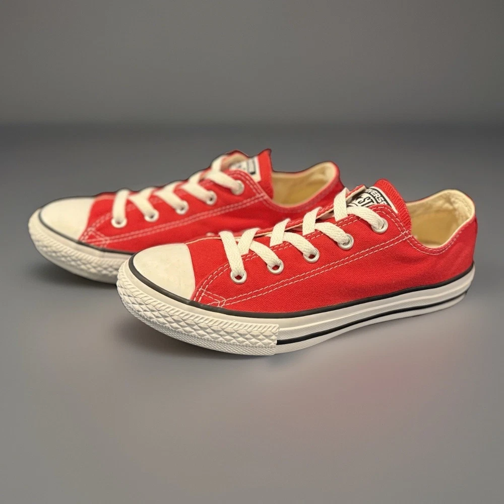 The product is a pair of Converse Chuck Taylor All Star low top sneakers in red and white, designed for casual occasions. These lace-up sneakers feature a canvas fabric type with a logo accent, perfect for school, athleisure, fun, and preppy themes. Ideal for walking and everyday wear, these unisex kids' sneakers are a stylish and comfortable choice for the summer, fall, and spring seasons. Made in Vietnam, they are a classic addition to any wardrobe, with a timeless design that has remained popular for generations.