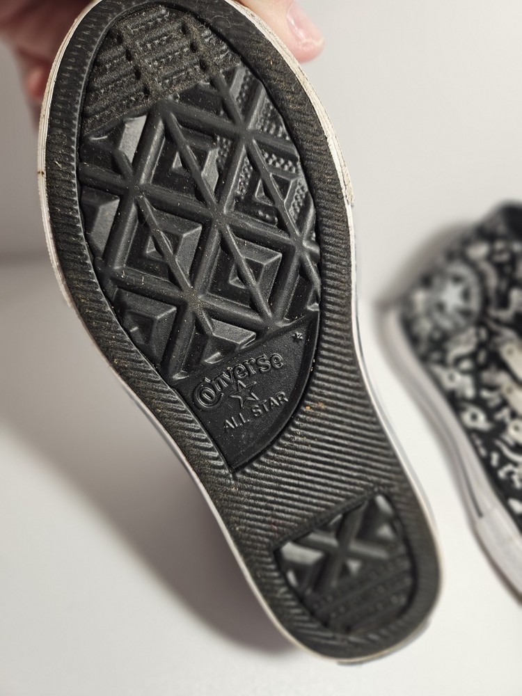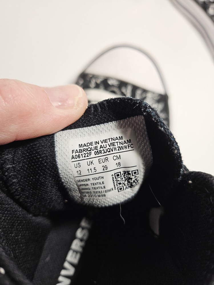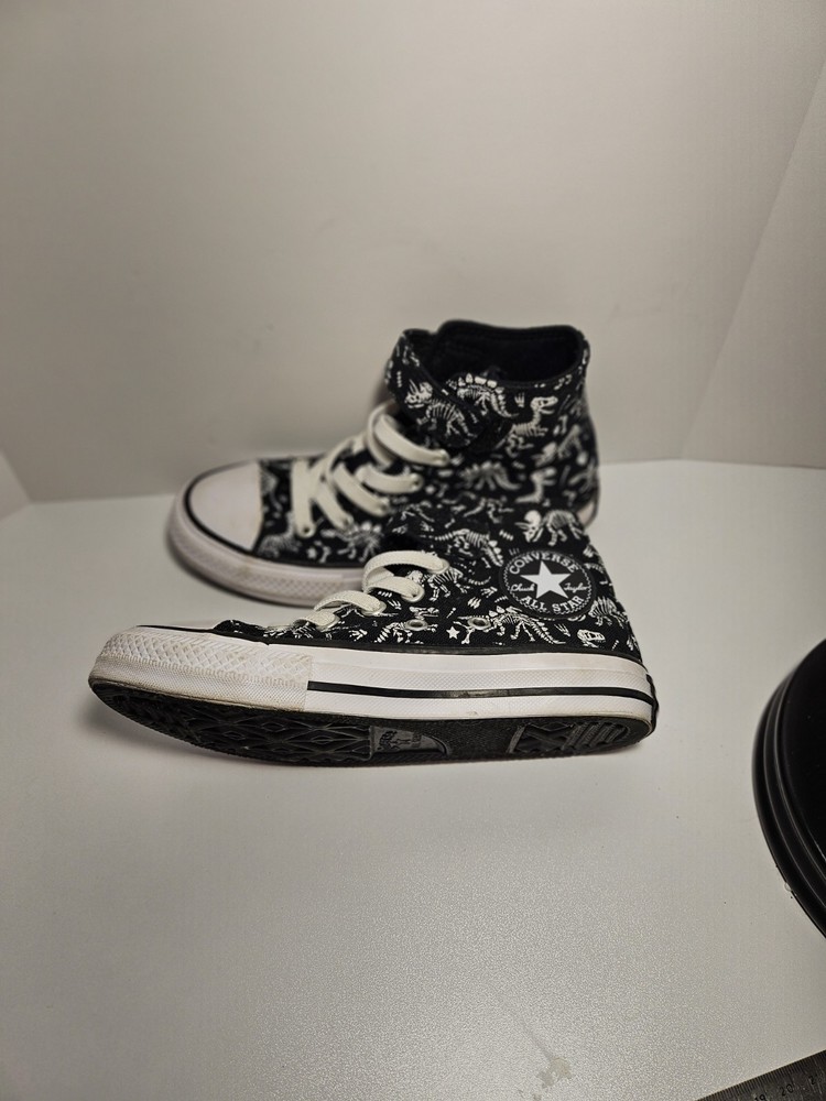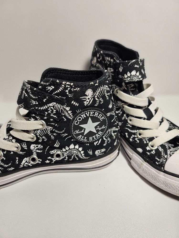 Brand: Converse Fabric Type: Canvas Country of Origin: Vietnam Shoe Shaft Style: High Top Toe Shape: Round Toe Season: Spring, Summer, Fall Product Line: Converse All Star Cushioning Level: Moderate Theme: Dinosaurs US Shoe Size: 13 Heel Style: Flat Color: Black Style: Sneaker Heel Height: Flat (Under 1 in) Handmade: No Model: Converse Chuck Taylor All Star Department: Unisex Kids Accents: Logo Features: Comfort Type: Athletic Closure: Lace Up Upper Material: Fabric Vintage: No Outsole Material: Rubber Shoe Width: Standard Occasion: Casual