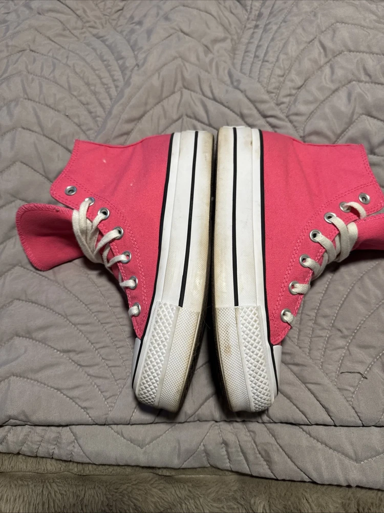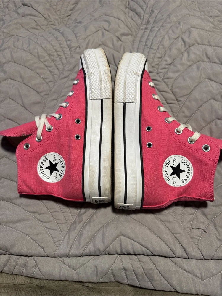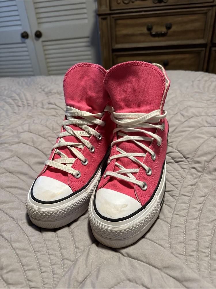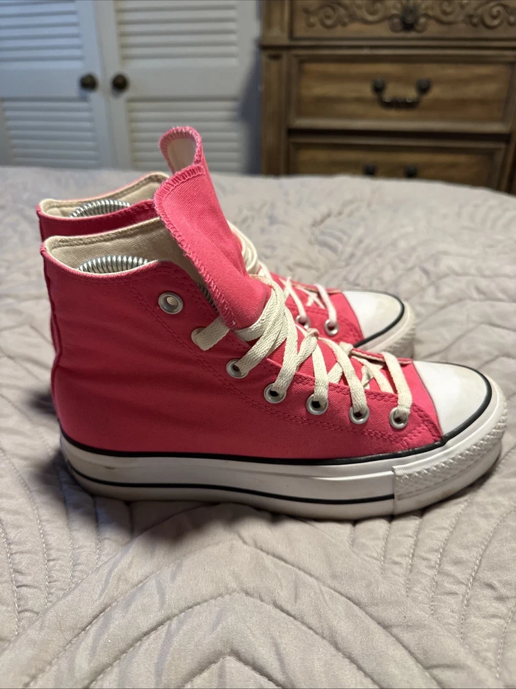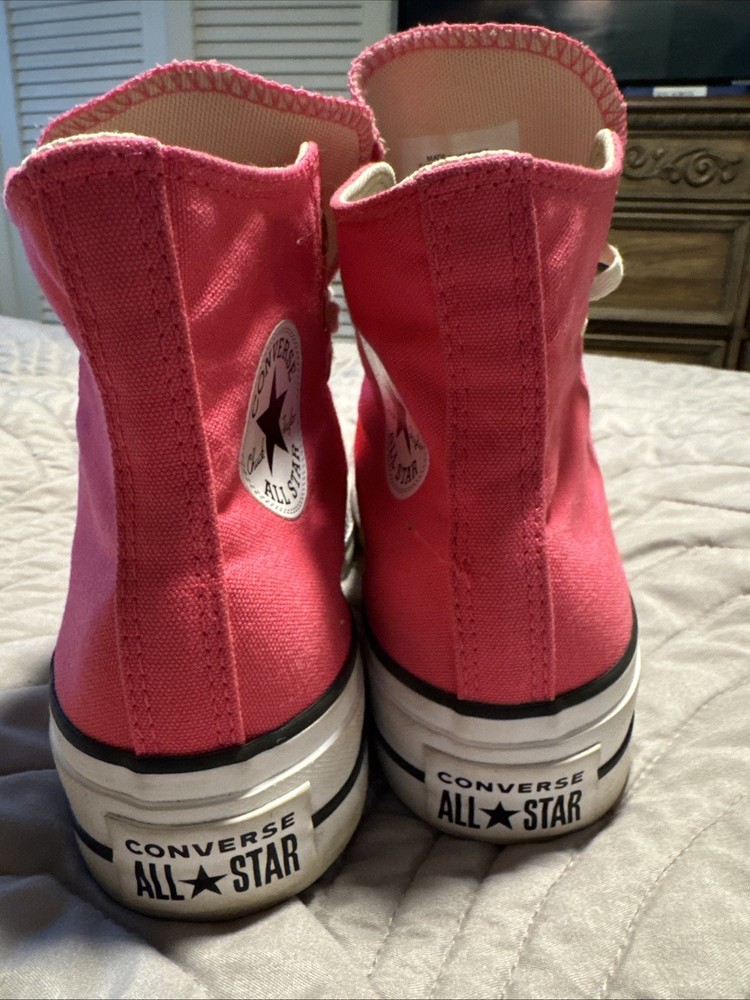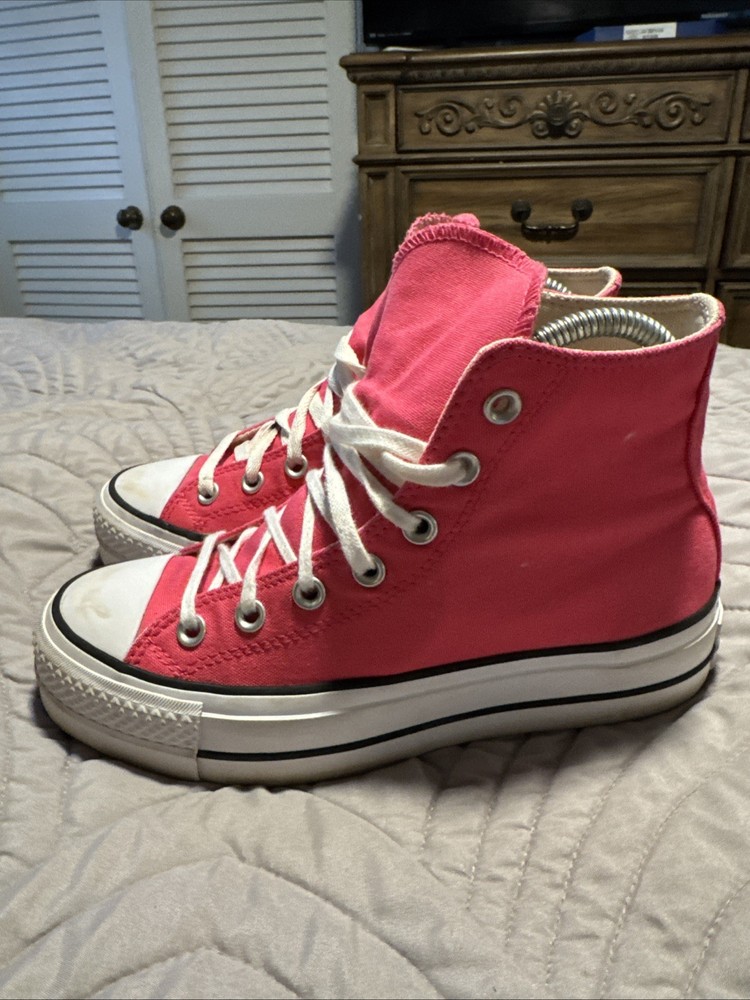 The Converse Women's Chuck Taylor All Star Lift Platform High Top Sneakers in Cerise Pink/White/Black are athletic shoes with a high top design. These sneakers feature a canvas upper material and are part of the iconic Converse Chuck Taylor product line. With a stylish and trendy color combination, these sneakers are perfect for women looking to make a statement with their footwear. The platform lift adds a unique touch to the classic Converse style, making these sneakers a fashionable choice for those who want to stand out.