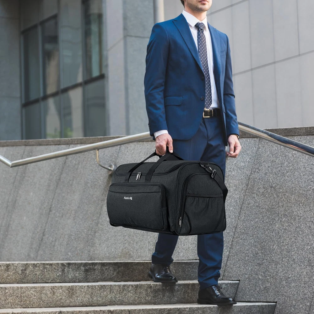 Humanized Design: Compared with others on the market, this halfday travel garment duffle bag uses one zipper design to ensure the bag is full-closed, not only more convenient for use but also keeps your items safer. Size: Our suit bag measures 22x 11.42x 13.39 inches,Weight: 2.98 pounds.Ideal for the people who go for a business trip, vacation, gym or destination wedding. Wrinkle-free:garment bags for travel was specially designed to keep your suit, dress clean, neat and wrinkle-free! There are 2 suit clips to keep your garment flat and prevent them from moving around while traveling without wrinkling your dress or suit, saving you time and effort on ironing. Separate Shoes Pouch:After assembled, this duffle bag for travel work perfect as a garment duffle bags for travel.At the left side pocket of this garment convertible weekender bag is a shoes pouch which has two vents vents.The right side pocket is designed for passport, keys and some other small items.There is also a mesh bag on the right side for some other things. More Pockets and Durable Material: Our convertible garment duffel bag has a lot of useful pockets inside, can hold suits, dresses, ties, other essentials and it is made of tear-resistant, water-resistant polyester fiber for long-lasting use.