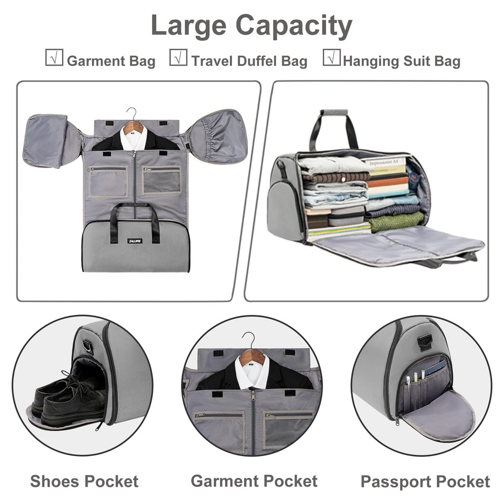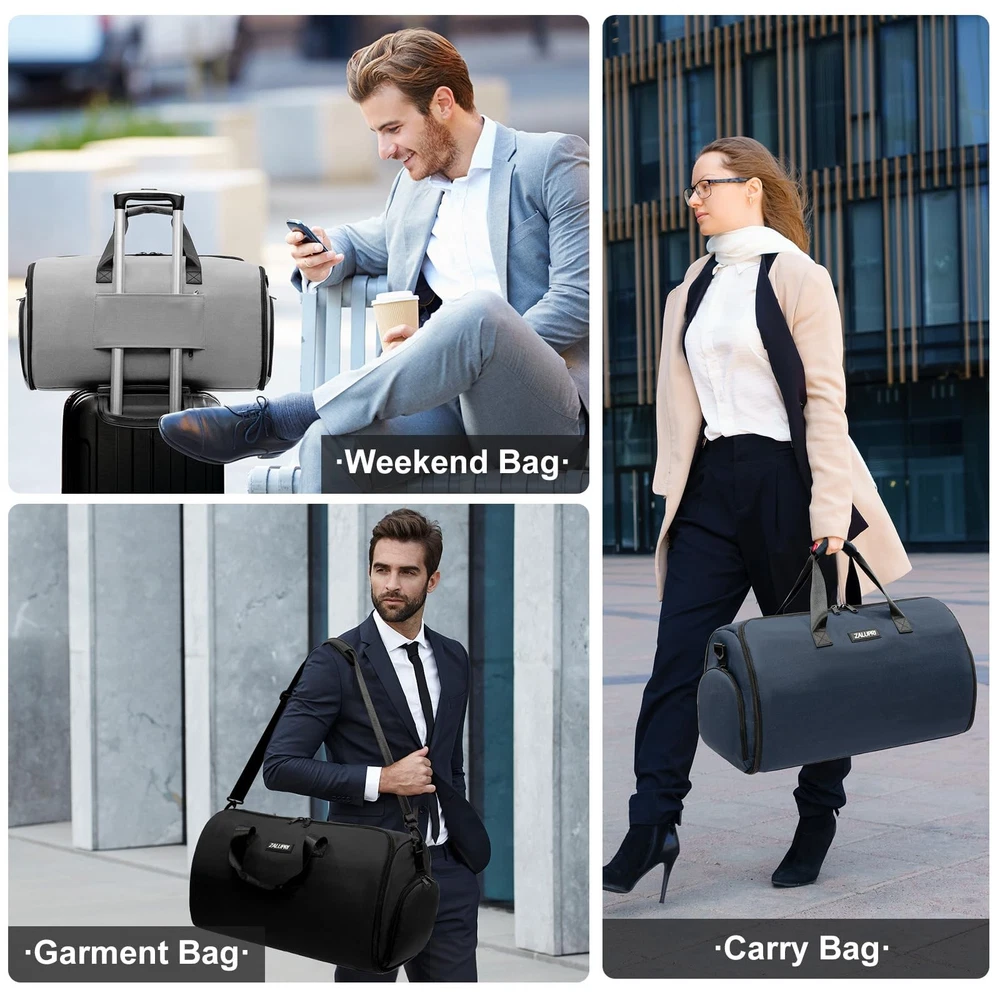 This convertible garment duffel bag is a game-changer for travel! The smart design effortlessly transforms from a weekender to a hanging bag, keeping clothes wrinkle-free. I love the 7 well-organized compartments—perfect for suits, shoes, toiletries, and essentials. The durable, water-resistant material holds up great, and the detachable straps make carrying a breeze. Super spacious yet compact enough for carry-on. A must-have for business trips or quick getaways!