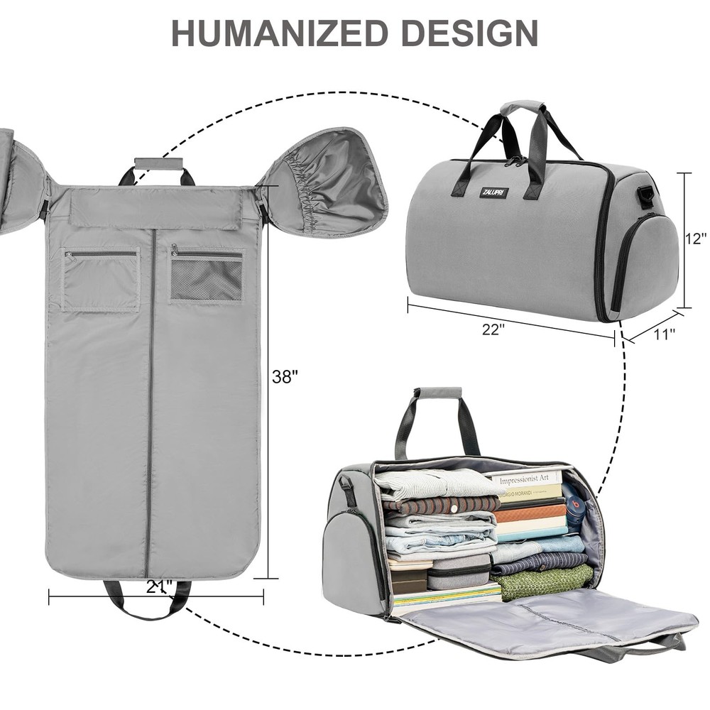 Versatile Design: Seamlessly switch between a travel weekender bag or a hanging duffel bag to suit your needs. Ample Storage: 7 compartments offer organized space, including a main compartment for suits/dresses, shoe pouch, passport pocket, toiletries pocket, and more. Wrinkle-Free: Single zipper design ensures secure closure for wrinkle-free clothing during travel. Durable Material: Made of tear-resistant, water-resistant polyester fiber for long-lasting use. Convenient Carrying: Detachable handle and belt with soft padding provide comfort while carrying. Easily foldable to save space when not in use. Size & Capacity: Garment Bag Dimension: 22"L x 11"W x 12"H; Duffel Bag Dimension: 38"L x 21"W; accommodates 2-3 days of essentials for travel.