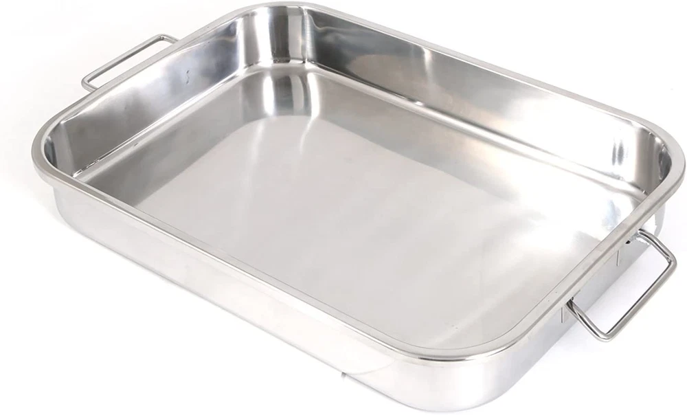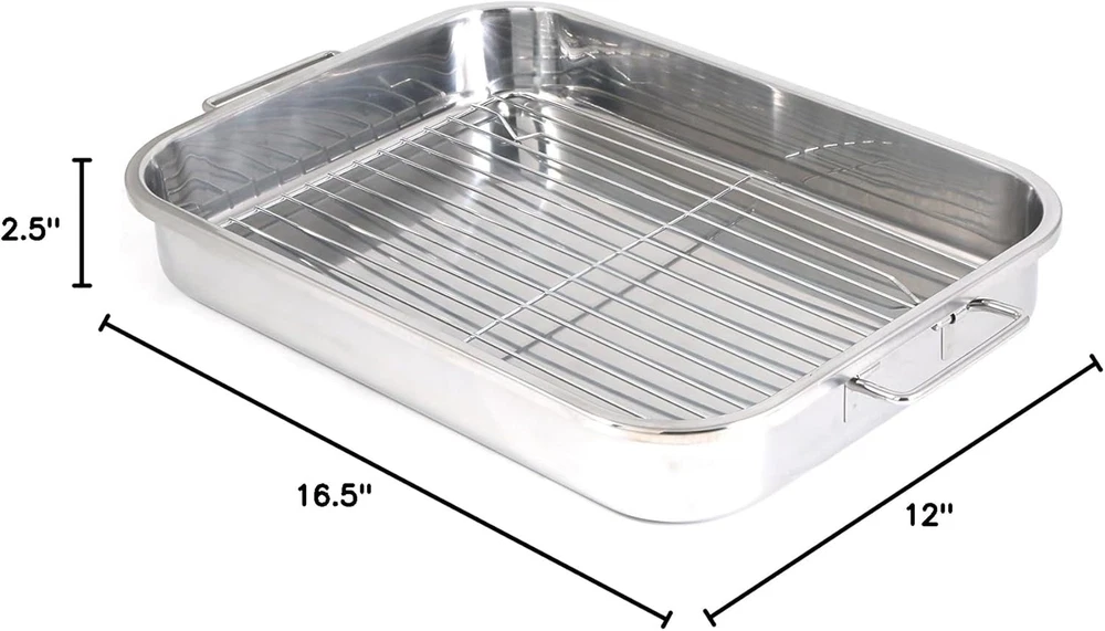 Constructed in durable stainless steel, these two pans and roasting racks are differently-sized for your convenience Stainless handles that make placing lasagnas into the oven and lifting them out, safe and easy The stylish mirror polished exterior also makes this all-in-one piece a perfect serving dish Both pans measure to 12.5" x 9.5" x 2.25" and 16.5" x 12" x 2.5" A must-have in every home Constructed in durable stainless steel, these pans come in two popular sizes for your convenience. Just the right size for multi-layered lasagnas. Includes two chrome racks for your favorite roasts. Comes with stainless foldable handles that make lifting in and out of the oven safe and easy. The stylish mirror polished exterior also makes this "all in one" a perfect serving dish.