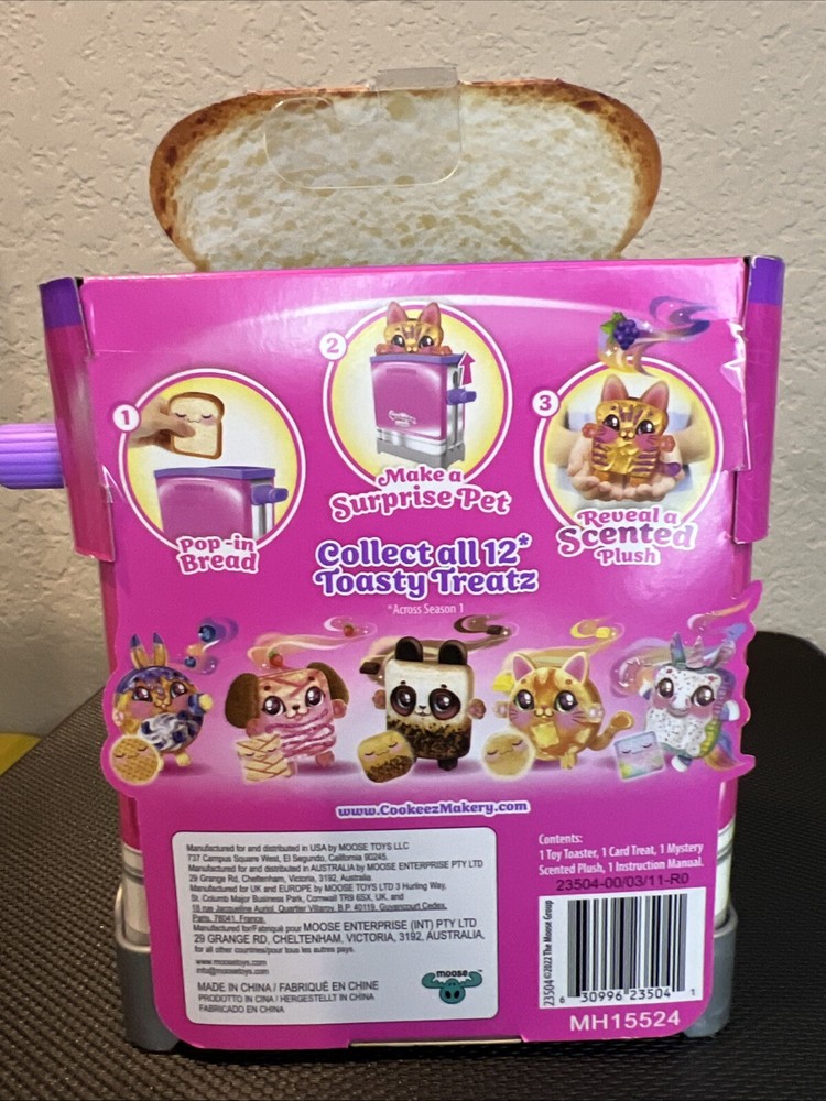 The Cookeez Makery Toasty Treatz toy is a fun and scented collectible featuring characters like Strudel Poodle, Pnutty & Jam Tiger, Pan Kitty, Unicorn Tart, and Pand. Unopened and new in its original box. With a theme of Breakfast Toys, this toy appeals to children aged 5 to 13 years and is filled with polyester material. The dimensions of this toy are 2.36 x 5.31 x 5.31 inches, making it a cute and collectible addition to any child's toy collection.