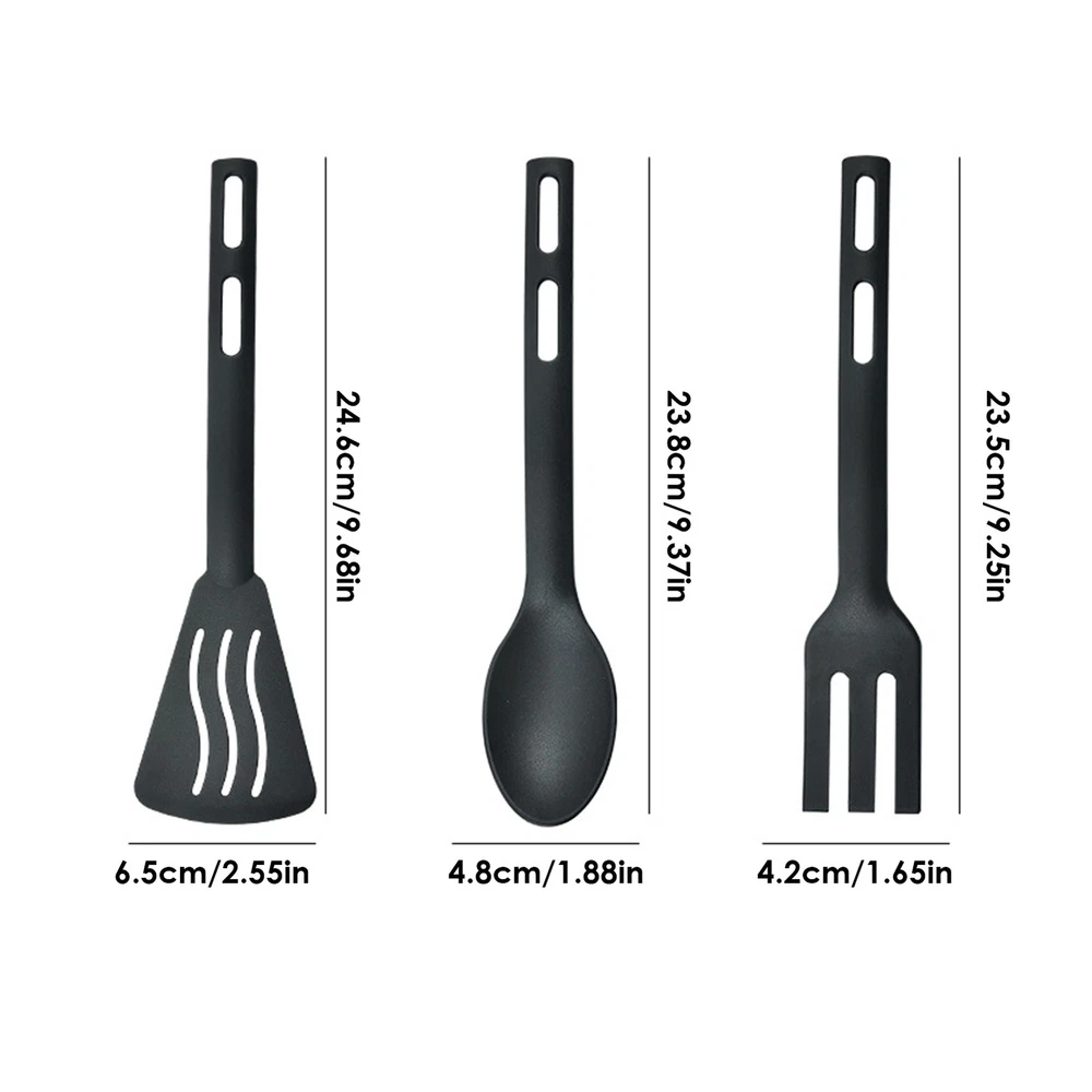 Bullet Points: Health-Conscious Cooking: Our high-end nylon cooking utensils provide a safe and healthy way to prep any food without compromising on taste or health. Durability at Its Finest: Our high and low temperature resistant nylon cooking utensils keep your cookware safe from scratches or dents while providing you with the ability to cook on any heat source. Ergonomic Efficiency: Nylon cooking utensils with soft and flexible handle for comfortable grip, prevent heat transfer, and convenient suspend holes for easy storage. Cooking made easier and safer. Multipurpose Cooking Tools: Serve up delicious pancakes, cupcakes, and cookies effortlessly with these nylon utensils. Use as a slotted spatula to fry eggs or turn chocolate cakes, or even as a sieve to let excess oil drip off hot soups and sauces. Practical Gifts: Our nylon cooking utensils are the perfect kitchen aid for people with hand discomfort, making it the best gift choice for anyone who loves cooking. Give the gift of comfort and practicality, a thoughtful present for any occasion. Our nylon kitchen utensils set is your perfect help in the kitchen! Made of high-quality nylon material, our utensils are highly resistant to both high and low temperatures. The soft and flexible handle ensures a comfortable grip, making it perfect for making delicious omelets and other meals. Name: Nylon Cooking Utensils Material: Nylon Product Size: Spatula: about 24.6x6.5cm/9.69x2.56 inches Spoon: about 23.8x4.8cm/9.37x1.89 inches Fork: about 23.5x4.2cm/9.25x1.65 inches product weight: Spatula: 21g Spoon: 22g Fork: 23g Package List: Nylon Cooking Utensils *1 Set (1 Cooking Spoon + 1 Slotted Turner + 1 Fork) Notes: Due to the lighting effects and camera angles, the color of the item and that shown in the picture might have a nuance. Due to manual measurement, there might be a tolerance in the product size.