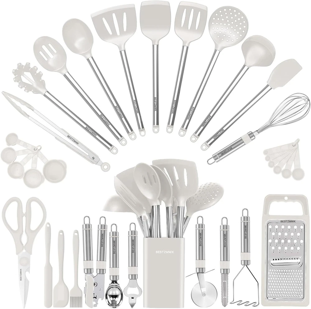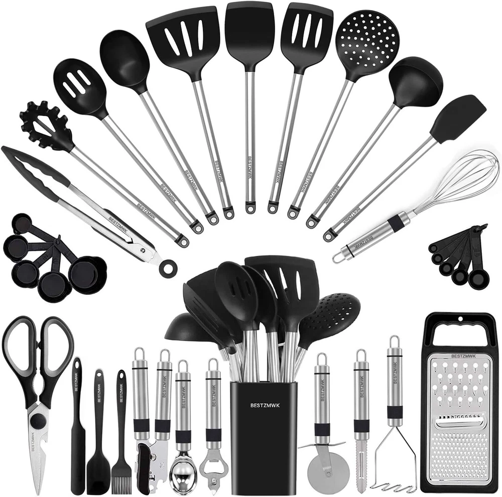 Product Description We only provide the high quality and most beautiful products, and the best service to you! This 33 piece silicone kitchen utensil set is High Quality,Heat Resistant,Nonstick Cookware.BPA free. This 33 piece bright set of cooking utensils are easy to use and easier to clean. If you are not completely satisfied with your purchase, you can return or replacement, no anyquestions asked. The Superior Silicone Utensils Set's Features: .Non-Stick .Ergonomic Design .BPA free .HYGIENIC Cooking Tools! .Heat Resistant (Up To 480℉) .Diswasher Safe and Easy to Clean .Beautiful Colors .High Quality and Durable Material: -Pure Silicone -Food Grade Silicone; -Products Fully Compliance with BPA free Instructions: -Heat Resistant 480℉ -Do Not Direct Fire Flame on the Utensil -Do Not Use Sharp Object to the Silicone Head -Keep Dry After Washing -The Sudden Change of Temperature Must Not Exceed 480oF While Being Used Ergonomic Handle These silicone utensils will treat your expensive non stick pans with care - the silcone coated heads are firm enough to mix, flip and stir with ease, yet coated in soft, flexible silicone so no more scratches. You will soon find this to be an essential set of cooking tools for your kitchen! Non-scratch If you are tired of unhygienic kitchen utensils that melt, warp or flake into your food, these solid silicone utensils will bring the joy back to your kitchen! Each piece in this set is designed to work perfectly and last for years. These utensils have ergonomic handles and a solid one-piece design; they are non stick friendly, high heat resistant and dishwasher safe. Heat-resistant The food-grade silicone is nontoxic and scentless, and it’s resistant to heat 480℉. So just cook any dishes you like! Special silicone material with great flexibility and the soft surfaces prevent your expensive non-stick pans from scratching and damage. It’s also very easy to clean. Food-Grade Silicone Food Grade Silicone no pollutants even at high temperatures or melts like plastic, no unpleasant plastic smell. They do not discolor, warp, melt or splinter like your typical nylon or wooden spatula. You will get 1xSlotted Spatula ,1xSlotted Spoon,1xFlexible Spatula,1xSlotted Turner,1x Solid Turner,1x Pasta Server,1xSolid Spoon,1x Kitchen Tongs, 1xDraining Spoon, 1xWhisk ,1xDeep Soup Ladle,1xSpatulas,1xBrush,1xPeeler,1xPizza Cutter,1xBottle Opener,1xPotato,1xPusher,Ice-cream spoon,1xCan opener,1xGrater,Scissors,10xmeasuring cups and spoons set,1xSmall Brush,1xSmall spatula,1xSpatula,1xHolder On Nov 21, 2024 at 20:38:07 PST, seller added the following information: