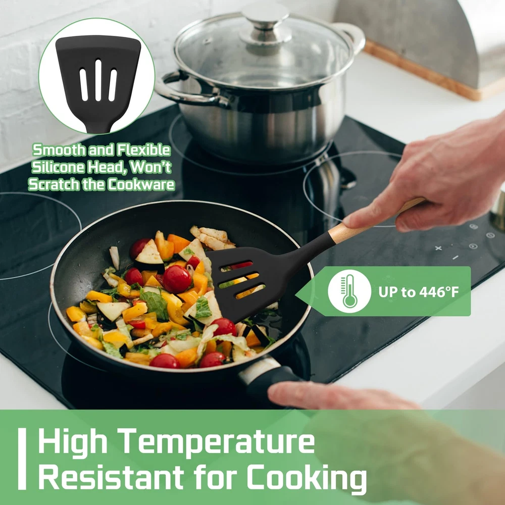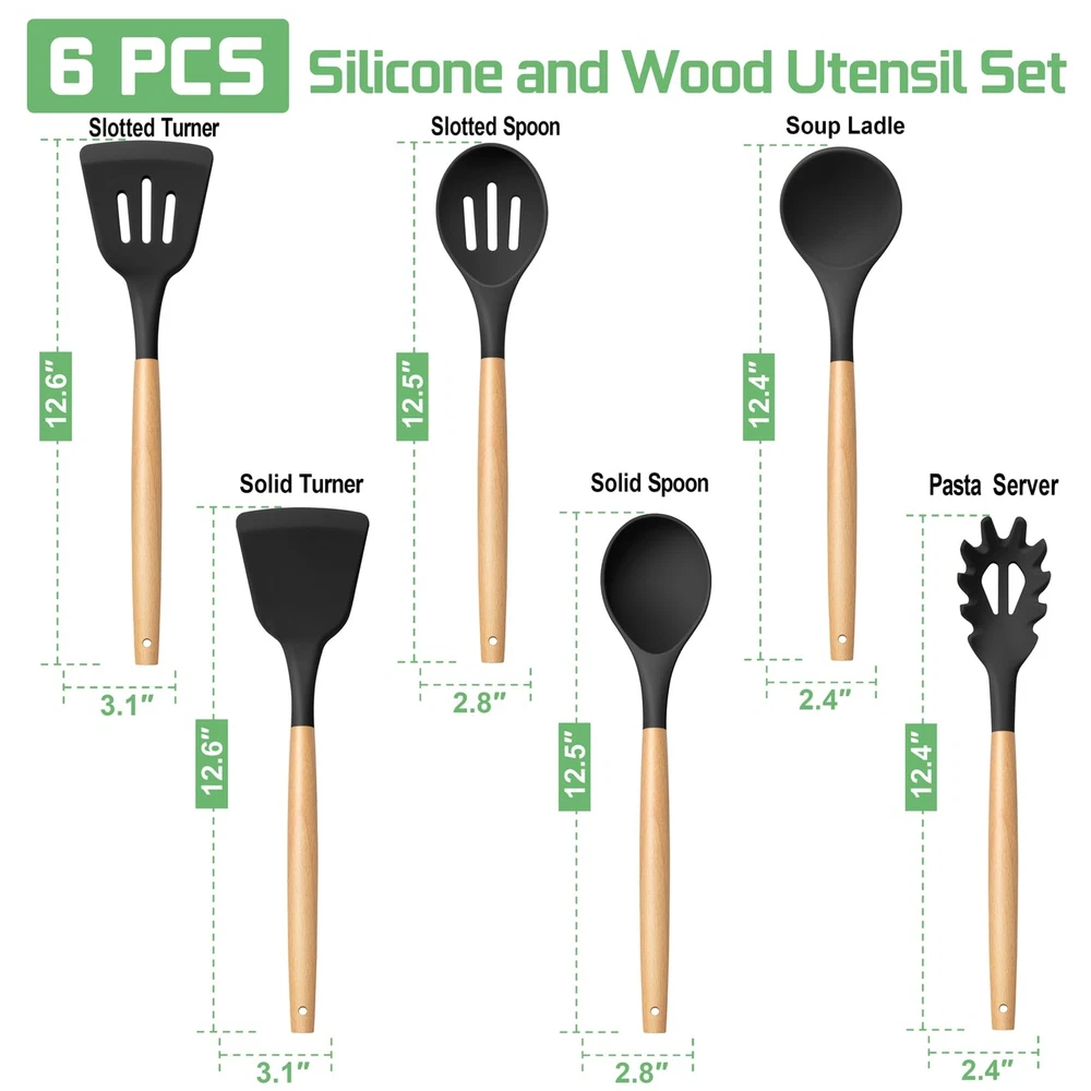 Black Silicone Cooking Kitchen Utensil with Wood Handle Set of 6 are made of food-grade silicone and wood, Without harmful substance leaching into your food, Can bear high temperature up to 446°F/230°C. All pieces utensils are friendly for your non-stick cookware and protect nonstick cookware for long serving time. The kitchen utensils with non-stick surface are easy to clean. The different options you will have with this set and meet your different cooking needs. An economical choice for your family. Specification: Material: Silicone, Wood Quantity: 6 Pcs Color: Black, Wood Tone 6-Piece kitchen utensil kit includes: 1 x Pasta server: 1 x Soup ladle 1 x Slotted turner 1 x Solid turner 1 x Solid spoon 1 x Slotted spoon Craft: Humanized handle, Hang loop, Smooth Features: Non-toxic, Heat-proof, Non-stick, Non-scratch, Easy clean and storage Why Choose Our Black Silicone Kitchen Cooking Utensil with Wood Handle Set of 6? 1. Silicone kitchen utensils’ head are made of food-grade silicone, can bear high temperature up to 446°F/230°C. 2. Smooth and soft silicone head won’t scratch the nonstick cookware. 3. The silicone cooking utensils includes 6 different utensils for many kinds of functions. 4. Ergonomic soft-grip handle with non-slip design can help you cooking better. 5. Small loop is convenient to hang on the wall, Easy to take and save space. Using Instruction: 1. Please wash the utensils before the first use. 2. Please soak them in warm water, wash by mild soap and hand dry after cleaning, store them in the dry place. 3. Please do not scratch the surface with wire balls or sharp tools. 4. Please do not expose to open flames. FOOD GRADE MATERIAL: The kitchen utensils set is made of healthy food grade silicone and wood without harmful substances, No odd smell or leave any other material taste and would not affect the taste of your foods, You can mix and stir it directly into the cookware, Safe and healthy for daily cooking use HEAT-PROOF & NON-SCRATCH: The silicone cooking utensils withstand high temperatures up to 446°F/230°C, Not easy to melt or burn when directly in the high temp, A good alternative choice sturdier than plastic and rubber utensils, Silicone head is scratch-proof and protects your non-stick pans, Extend the lifespan of your kitchen cookware THOUGHTFUL DESIGNS: The soft silicone head bond with wooden handle design makes the utensil firm and not easily breaking off or falling apart, Smooth wooden handles gives you a comfortable grip, Won’t hurt your hands, Modern black and natural wood tone combination decorates your kitchen MULTIFUNCTIONAL KITCHEN TOOLS: Silicone cooking utensil set includes 6 different kitchen utensils set meet many kinds of your cooking needs, Includes slotted and solid turner, deep soup ladle, solid serving spoon, slotted spoon, pasta server, For cooking, turning, serving, mixing, and more, Great tools for kitchen daily use EASY TO CLEAN & EASY STORAGE: The cooking utensil with non-stick surface, Easy to clean up by hand, Every end of the silicone utensil has a hanging loop helps effortless hanging on the hooks, Also ideal for storing in the utensils holder or kitchen drawer, Won’t take up a lot of space