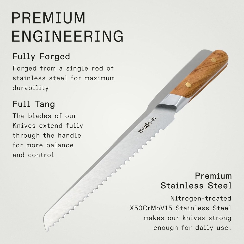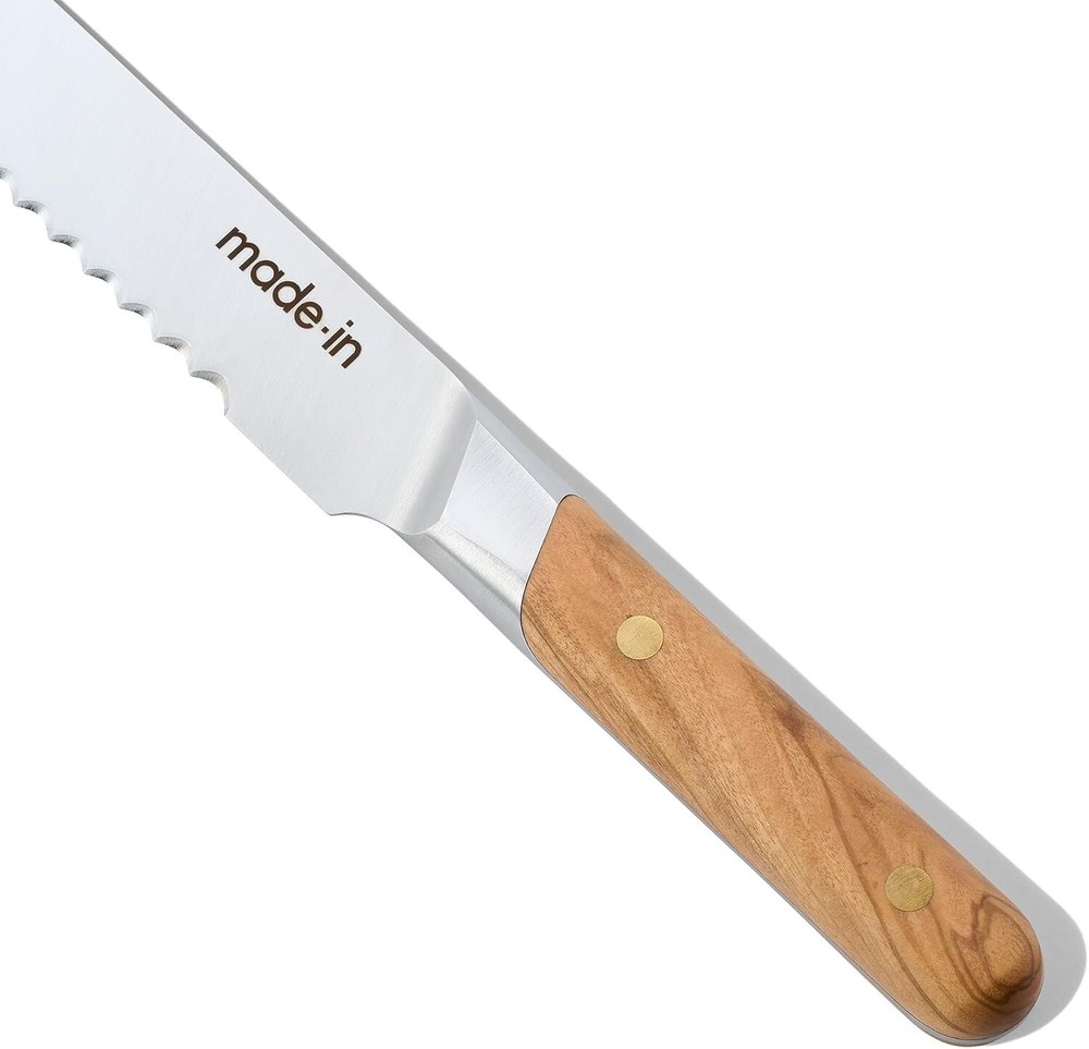 Cookware - 9" Inch Bread Knife - Crafted in France - Full Tang With Olive Wood Handle Blade Length: 9” | Blade Height: " | Blade Thickness: 2 mm | Total Length: 14” Stainless Steel Blade - Nitrogen-treated X50CrMoV15 Stainless Steel makes Knives strong enough for daily use Full Tang - The blades of Knives extend fully through the handle for more balance and control Fully Forged - Knives are forged from a single rod of stainless steel for maximum durability Sensational Slicing - This Bread Knife was designed in partnership with Nancy Silverton to effortlessly slice your baguettes, ciabattas, or sourdough France - Knives are forged by a 5th generation bladesmith in the knife capital of the world: Thiers, France