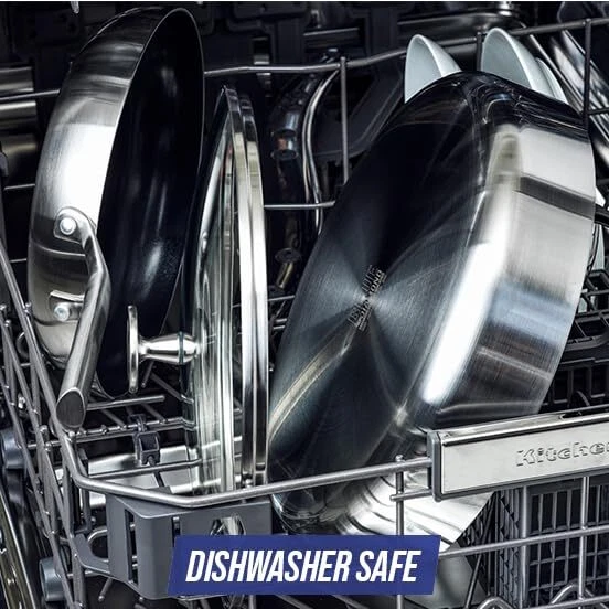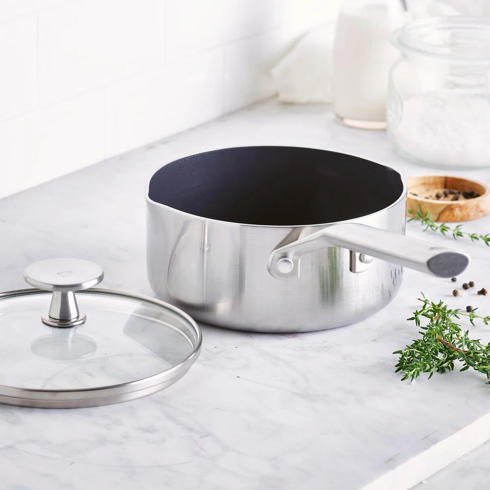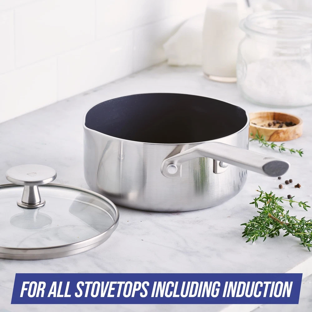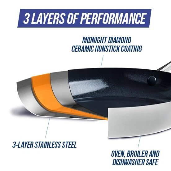 Shine on the stovetop with ’s Triple Steel collection. Triple Steel features stainless steel layers surrounding an aluminum core that extends throughout the pan to deliver responsive performance with unbelievable power. Our unique Midnight Diamond coating is an eye-catching update that works with the 3-ply body to promote fast and even heating, incredible durability, and dazzling results on all stovetops, including induction. The stay-cool handles keep the collection comfortable on the stovetop while their unique angle makes these pans stackable for easy storage. Glass lids provide an easy look at any meal in progress. Dishwasher safe. Oven safe to 600°F, glass lids to 425°F. Cookware set includes: 8”, 9.5”, and 11” frying pans; 2QT and 2.5QT Chef’s pans with lids; 6QT stock pot with lid; nylon slotted turner and solid spoon. MIDNIGHT DIAMOND NONSTICK: The dynamic diamond-reinforced coating is metal utensil safe and works with the 3-layer stainless steel body to provide incredible performance INCREDIBLE HEAT TRANSFER: Our pans heat up super quickly and evenly to save you time and energy. Say goodbye to cold or hot spots with the incredible heat transfer of TOXIN-FREE: This collection’s healthy ceramic nonstick coating is free of PFAS, PFOA, lead, and cadmium 3-PLY STAINLESS STEEL BODIES: layers of stainless steel surround an aluminum core for ultra-durability and fast and even heating. STACKABLE HANDLES: The stackable stainless steel handles offer a sturdy, comfortable grip and make storing easier ENJOY THE VIEW: The tempered glass lids keep heat and moisture inside so you can watch all the action on the outside BUILT FOR EVERY KITCHEN: Oven and broiler safe up to 600°F and suitable for all stovetops, including induction EASY TO CLEAN: These pans are dishwasher safe for easy cleanup, but most messes will wipe clean