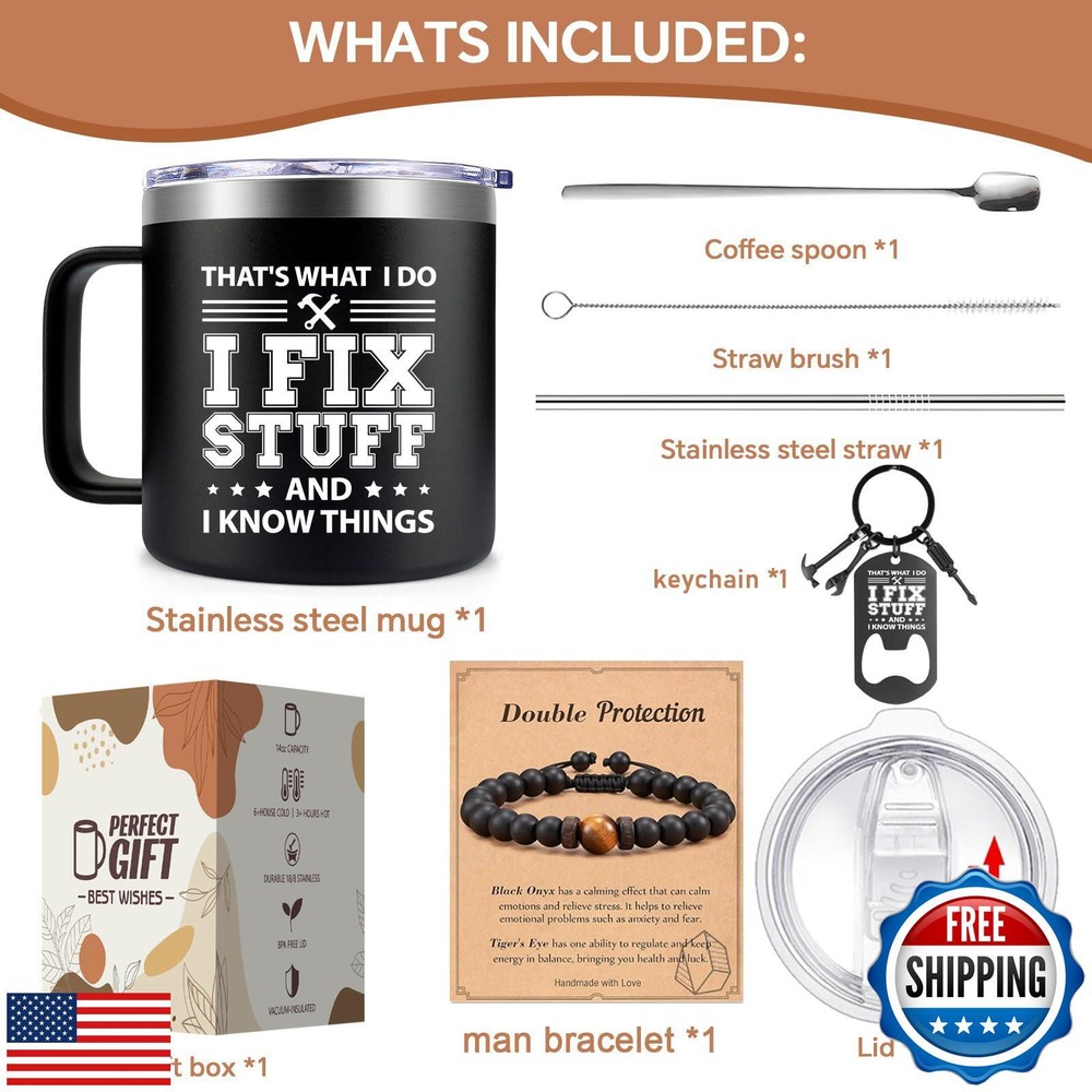 Fufendio Fathers Day Gift for Dad - Cool Birthday Gifts for Men - I Fix Stuff and I Know Things Mug 14oz - Birthday Christmas Gifts for Him Grandpa Uncle Brother Husband Features MUG FOR HIM: This mug featuring the clever phrase 'That's What I Do I Fix Stuff and I Know Things,' would make a wonderful gift for Father's Day, Christmas, or any special occasion worth commemorating WHAT'S INCLUDED: It comes packaged in a gift box and includes a stainless steel mug, a leak-proof lid, a opener keychain, a coffee spoon, a straw and straw brush SPILL PROOF GUARANTEE: This mug have an easy-to-grip handle. It's also dishwasher-safe, making cleaning a breeze. Its design is ideal for individuals with busy, fast-paced lifestyles DOUBLE WALL VACUUM INSULATED: Crafted with double-wall insulation. It keeps your drinks steaming hot for up to 3 hours and refreshingly cold for over 6 hours USE FOR MANY OCCASIONS: This mug is suitable for use in indoor or outdoor setting, making it perfect for enjoying drinks at home, on the beach, by the lake, at the pool, in the office Shipping Free & Fast Shipping: We offer free shipping to most of the USA with a normal delivery time of 3-7 days. However, due to the current situation, additional delivery time (up to 3 weeks) may be required for some items. Alternative Carriers: We may use alternative carriers (e.g., USPS, FedEx, UPS) to ensure your package arrives safely and on time. Due to the use of multiple carriers, we are unable to provide a tracking number automatically. Handling Time: Orders are processed and shipped within 1-2 business days of receiving cleared payment. Shipping Restrictions: Shipping to Alaska, Hawaii, Puerto Rico, Guam, and other US territories may incur shipping charges or delivery restrictions. Please contact us before ordering, or your order can be refunded/cancelled. State Restrictions: Certain items may not be shipped to California due to state regulations. Contact for Tracking Updates: If you require tracking updates or have any concerns about the delivery of your order, please feel free to contact us, and we will be happy to assist you. Return Policy 30-Day Hassle-Free Returns: If you are not completely satisfied with your purchase, you can return the item for free within 30 days of receiving it for a full refund or exchange. Easy Return Process: Contact us, and we will provide you with a prepaid return shipping label and detailed instructions. No Restocking Fee: There are no restocking fees for returns. However, the buyer is responsible for return shipping costs if the return is not due to a seller's error. Refund Processing: Refunds will be processed within 1 business day of receiving the returned item in its original condition. Payment We accept all major credit cards, PayPal, and Apple Pay for your convenience. Your payment information is secure and encrypted to ensure a safe and seamless transaction. Please complete your payment within 3 days of purchase to avoid any delays in shipping. Feedback Your feedback is extremely important to us. We strive to provide the best products and customer service possible. If you are satisfied with your purchase, please take a moment to leave us a positive review. If you have any concerns or issues with your order, please contact us before leaving negative feedback. We are committed to resolving any problems and ensuring your satisfaction. Contact Us If you have any questions or concerns, please feel free to reach out to our customer support team. You can contact us through the eBay messaging system. We are available Monday to Friday, 9:00 am to 5:00 pm EST, and we will do our best to respond to your inquiry within 24 hours. Thank you for supporting our small family business!