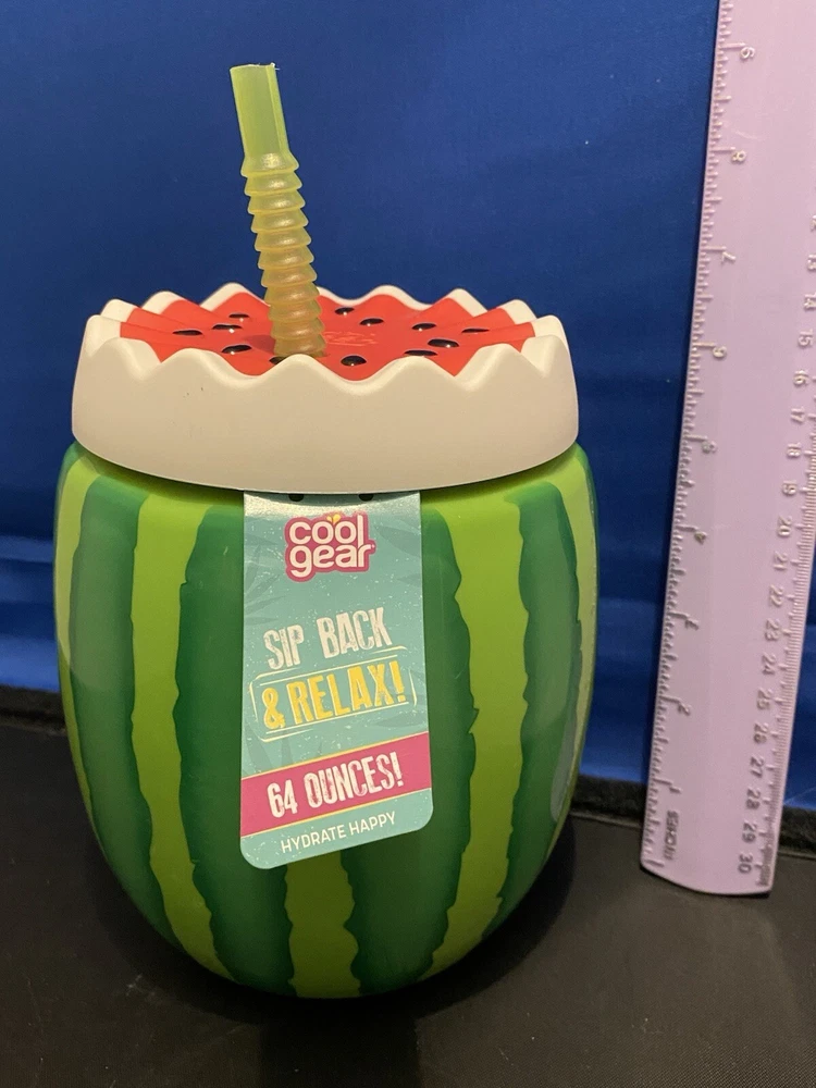 This Cool Gear™ tumbler features a fun watermelon design, perfect for all occasions. Made of BPA-free plastic, the 64oz tumbler comes with a straw and lid for convenience. The round-shaped tumbler is designed for teens and has a pop art style, with a theme centered around fun and curiosity, holidays, and food & drink. The item is 6 3/4 inches in height and 5 1/2 inches in width, making it a unique and practical drinkware option for anyone looking to sip back and relax in style.