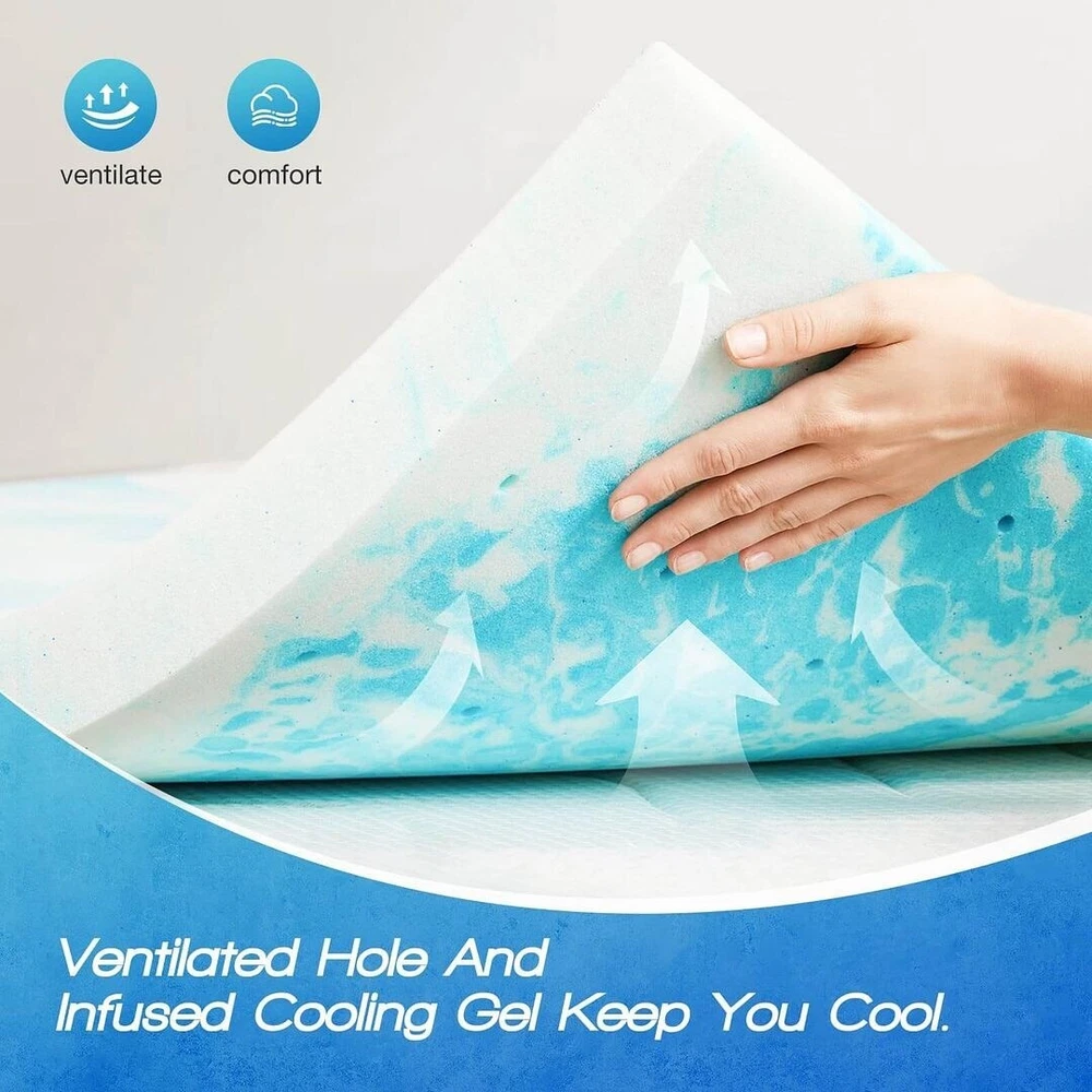 Transform your bed into a haven of comfort with our meticulously crafted mattress topper. Made from high-density memory foam, it conforms to your body's contours, relieving pressure points and minimizing discomfort for a restful night's sleep. The innovative material adapts to your body shape, providing targeted support and alleviating common aches and pains. The topper is infused with a breathable gel layer, ensuring a cool and comfortable sleep by dissipating heat and regulating body temperature. Say goodbye to restless nights and wake up refreshed and energized with our 2-inch topper.Features: High-density memory foam for unbeatable support and relaxation. Conforms to body contours, relieving pressure points for restful sleep. Innovative material adapts to body shape, targeting Free Shipping Over $49.99* Details Cool Gel Infused Hypoallergenic Cooling Memory Foam Mattress Topper Product Description: Transform your bed into a haven of comfort with our meticulously crafted mattress topper. Made from high-density memory foam, it conforms to your body's contours, relieving pressure points and minimizing discomfort for a restful night's sleep. The innovative material adapts to your body shape, providing targeted support and alleviating common aches and pains. The topper is infused with a breathable gel layer, ensuring a cool and comfortable sleep by dissipating heat and regulating body temperature. Say goodbye to restless nights and wake up refreshed and energized with our 2-inch topper. Features: High-density memory foam for unbeatable support and relaxation. Conforms to body contours, relieving pressure points for restful sleep. Innovative material adapts to body shape, targeting support where needed. Infused with a breathable gel layer for year-round cooling comfort. Crafted with meticulous attention to detail for quality sleep every night.
