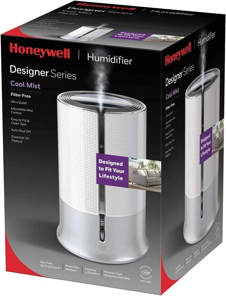 COOL MIST COMFORT: This filter free, ultra quiet humidifier provides cool mist comfort with style. It features adjustable mist output control & an illuminated water window with adjustable tank light AROMATHERAPY & EASY-FILL DESIGN: Add a few drops of your favorite oils to the Essential Oil Tray for added aromatherapy comfort. A 1.25 gallon tank features a wide opening that's easy to fill & clean HONEYWELL HUMIDIFIERS: Dry air can irritate health issues & humidity levels in your home between 40-60% can make the air feel warmer & improve breathing comfort, sleeping, nasal congestion & dry skin HUMIDIFIERS FOR BABIES, CHILDREN, ADULTS: Many find that a humidifier for the home, bedroom or nursery is an essential part of a good nights sleep when the air is dry, in allergy season, or when sick Product information Special Feature Cool Mist Comfort Color White Operation Mode Ultrasonic Product Dimensions 8.8"D x 8.8"W x 13.2"H Item Weight 6.6 Pounds Room Type Bedroom, Nursery Model Name Designer Series Cool Mist Humidifier Included Components 1 Humidifier Control Method Touch Shape Round UPC 328785001723 Global Trade Identification Number 00328785001723 Item Weight 6.6 pounds Country of Origin China Item model number HUL430W